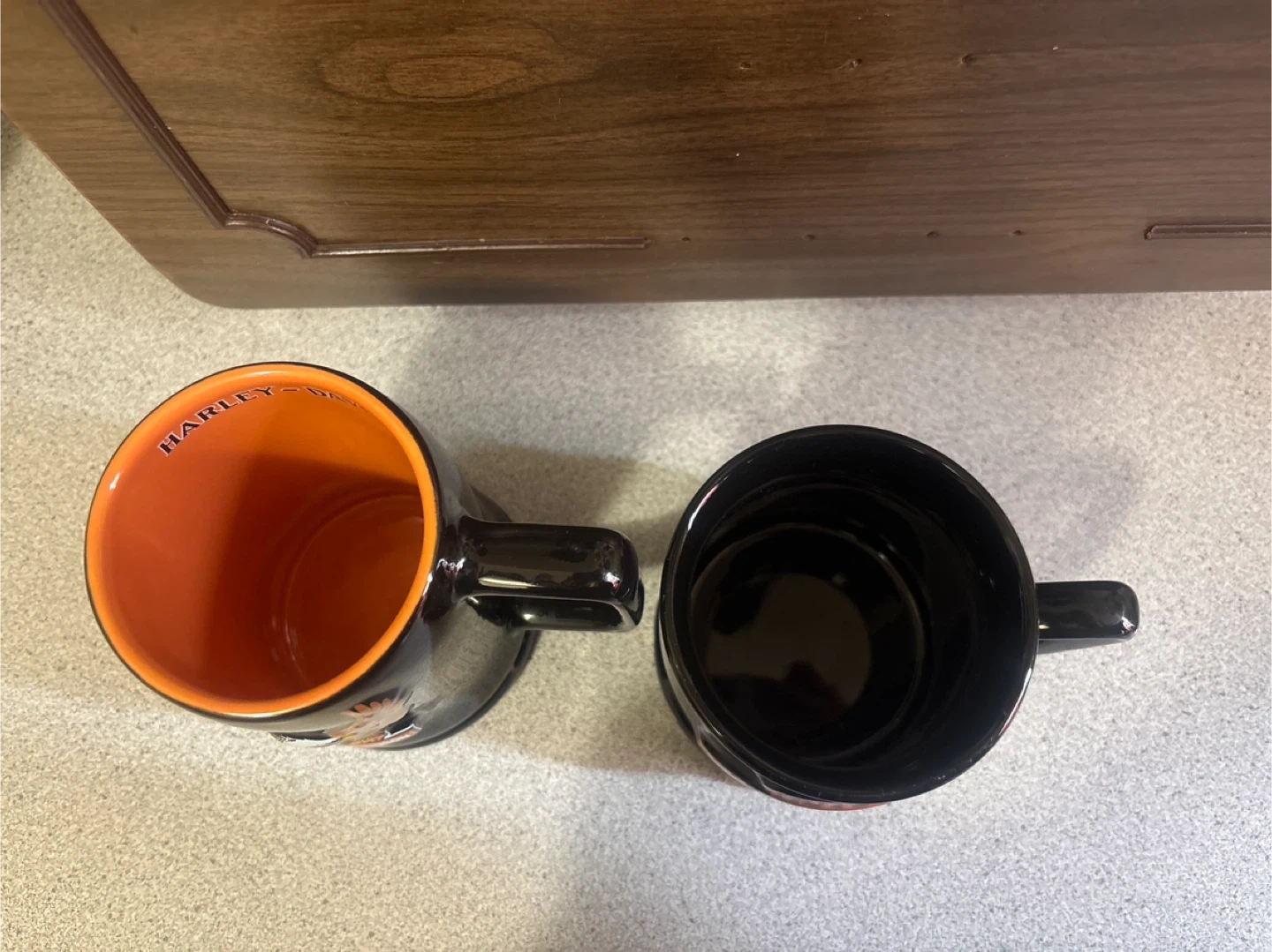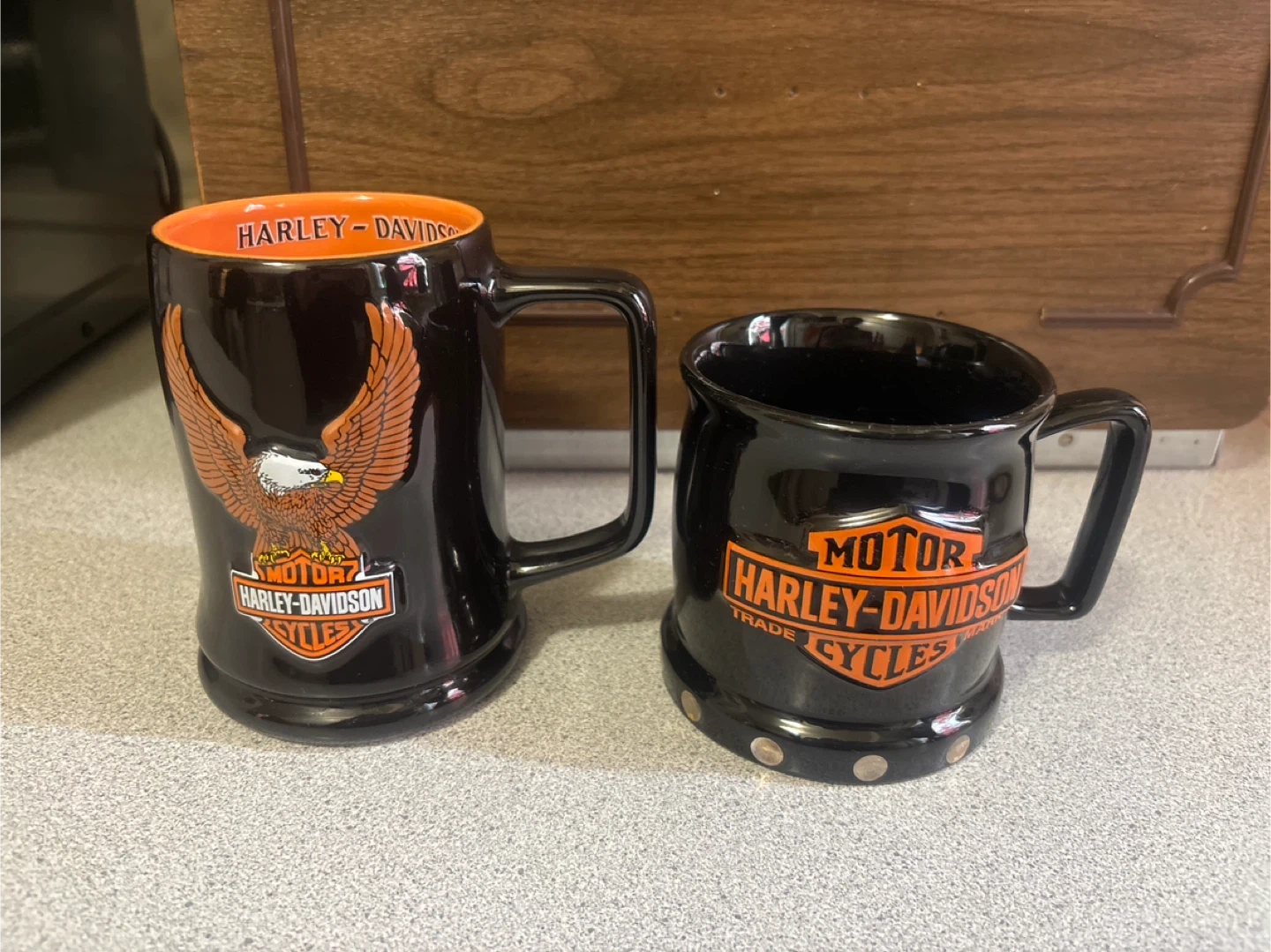68Selling a set of two Harley-Davidson mugs! One mug is larger with an eagle design and orange interior, while the other is a smaller, stout mug with the classic Harley-Davidson logo. Both are in great condition and ready for your morning coffee or to add to your collection 1 for $8 or 2 for $10