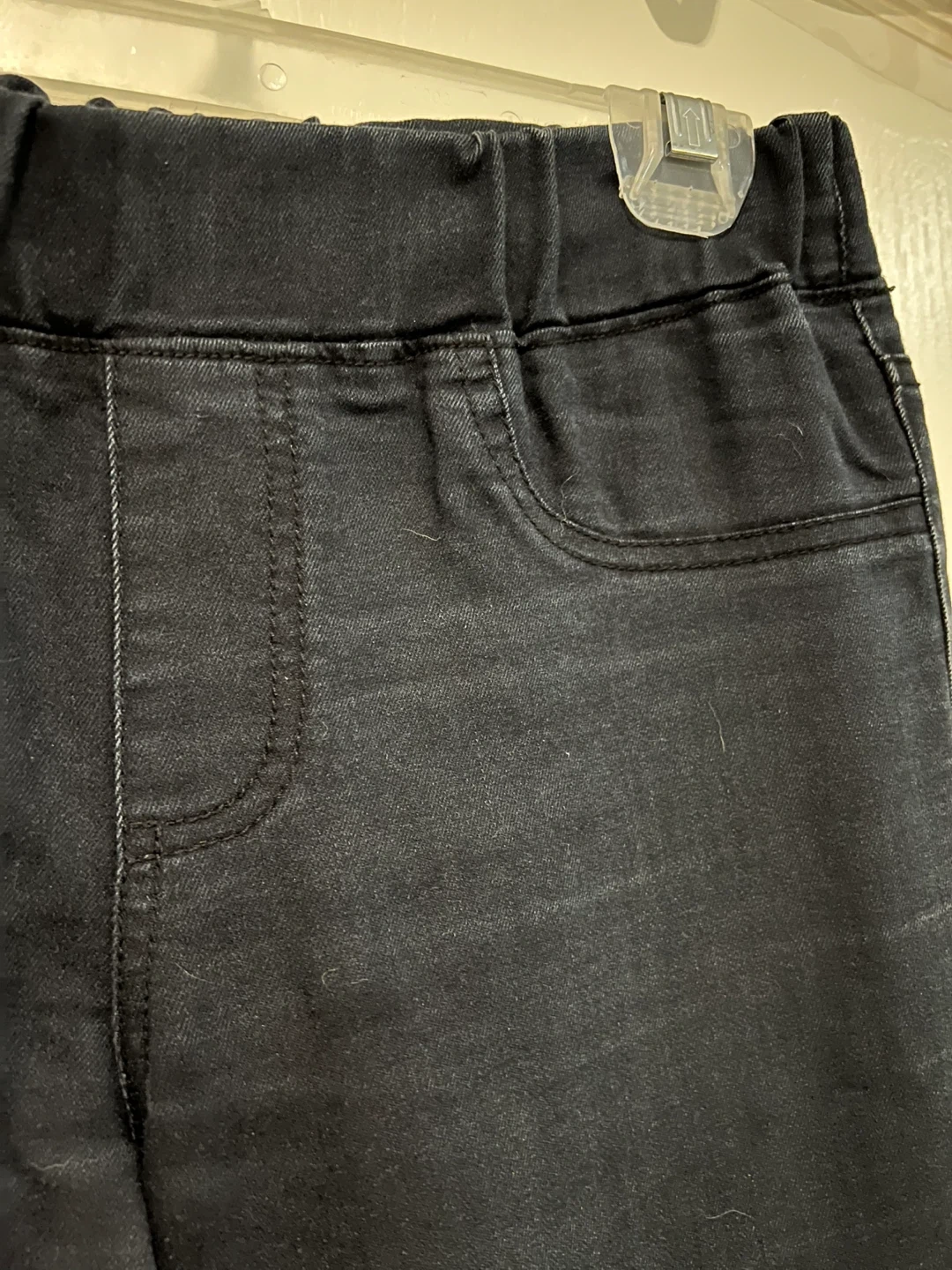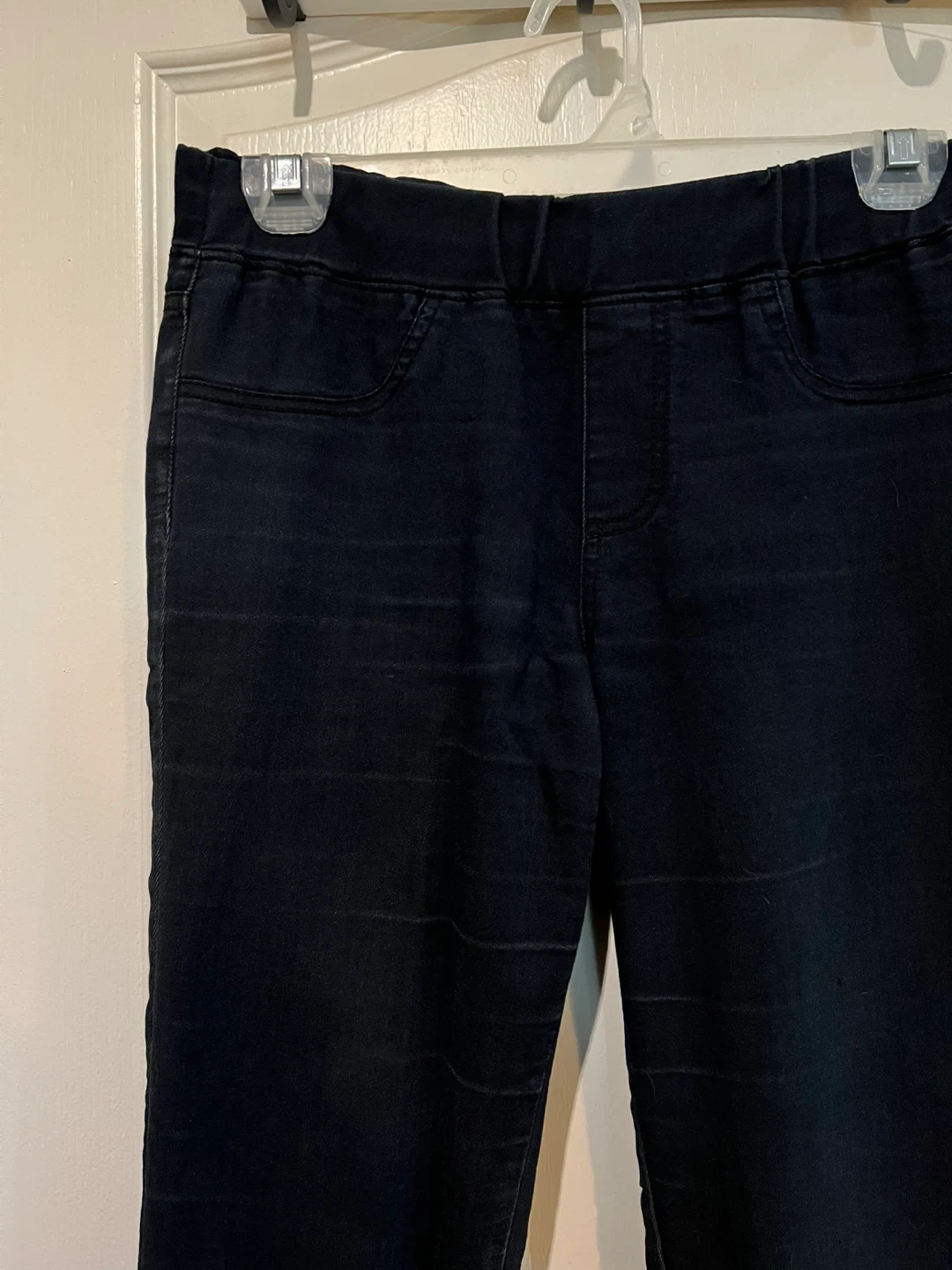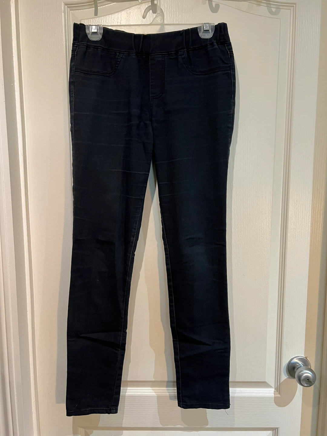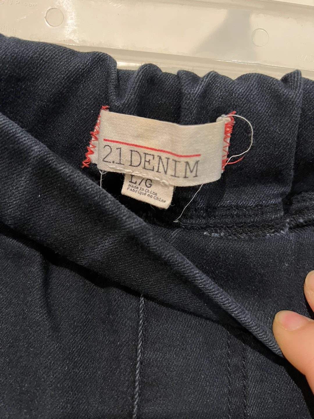 Comfy black jegging from 2.1 Denim in a size large. Soft and slightly stretchy. I’d say they fit more medium (4-6).