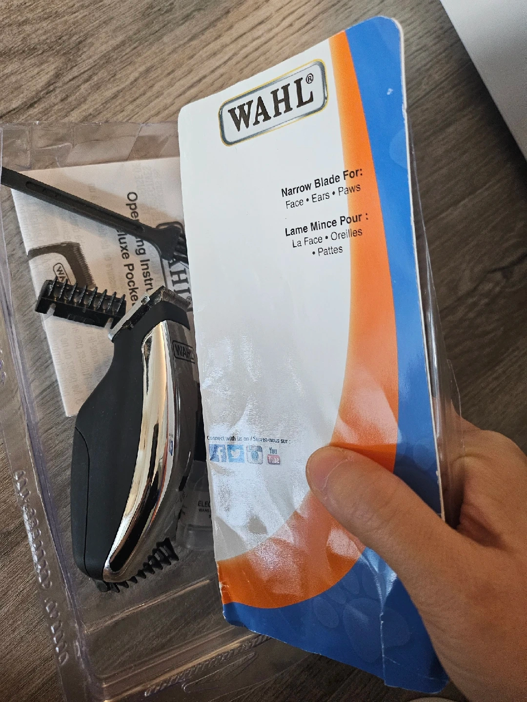Selling a gently used WAHL narrow blade trimmer, still in its original packaging! This trimmer is perfect for grooming face, ears, and paws. Comes with opening instructions and a deluxe pocket.