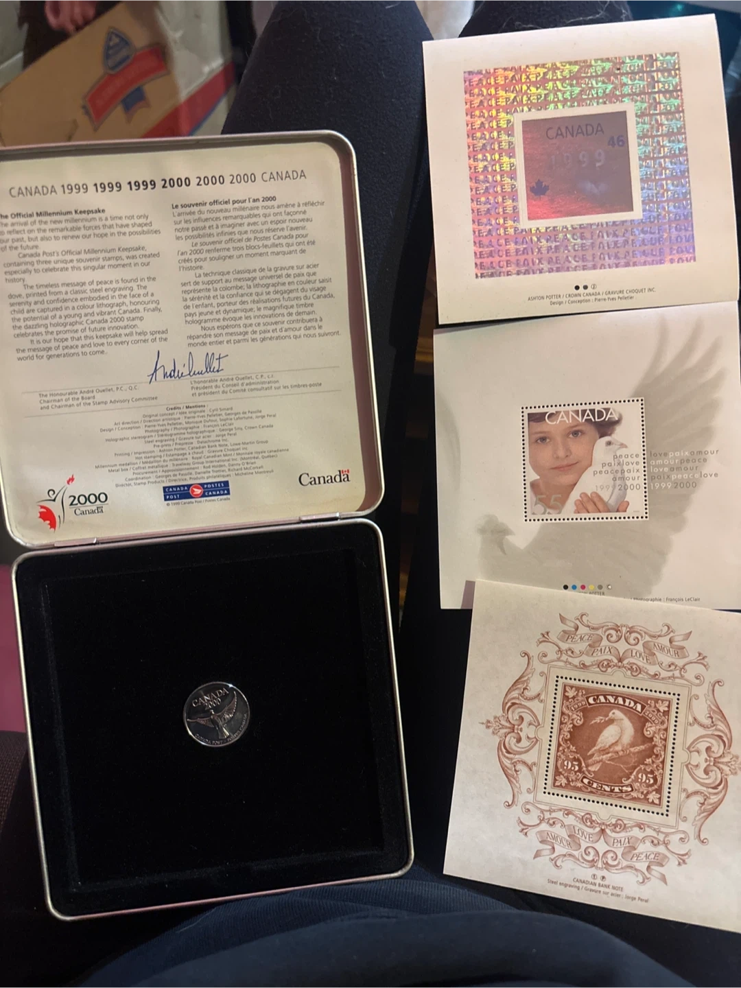 Selling a Canada Millennium Keepsake set, featuring stamps and a coin from 1999-2000 - Includes three unique souvenir stamps - Coin representing the year 2000 - Comes in the official Millennium Keepsake tin
