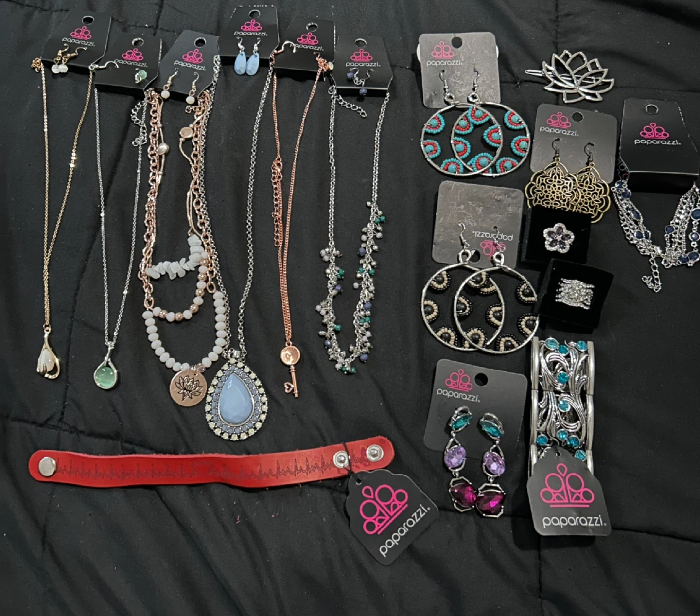 Selling a lot of assorted jewelry from Paparazzi! Includes necklaces, earrings, rings, and a bracelet. Great for adding some sparkle to your outfits! 16 Pieces.