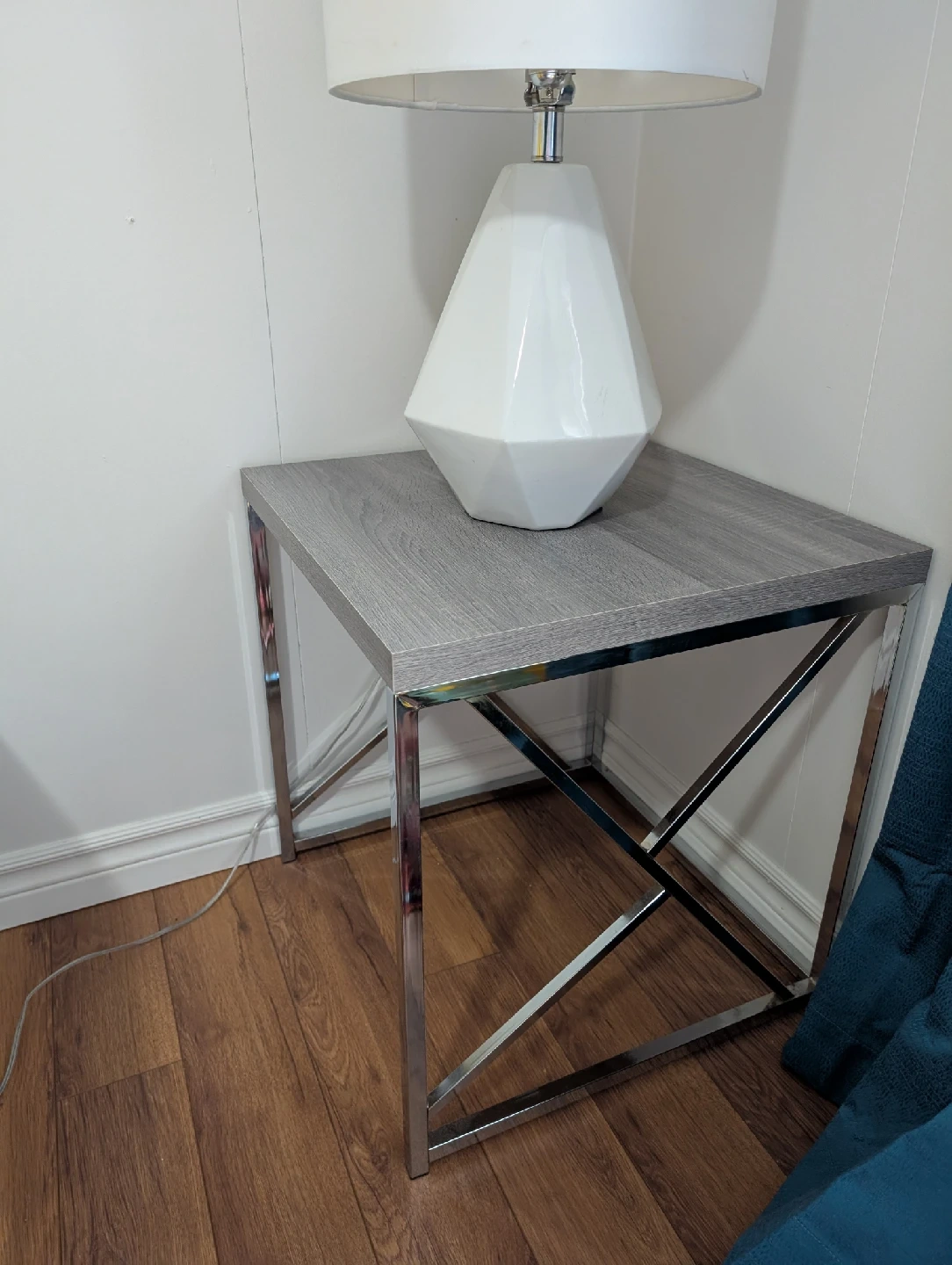 Selling a cute side table with a lamp! The table has a grey wood-look top and a chrome-style metal frame. The lamp has a white geometric base and a white shade. Perfect for a bedroom or living room