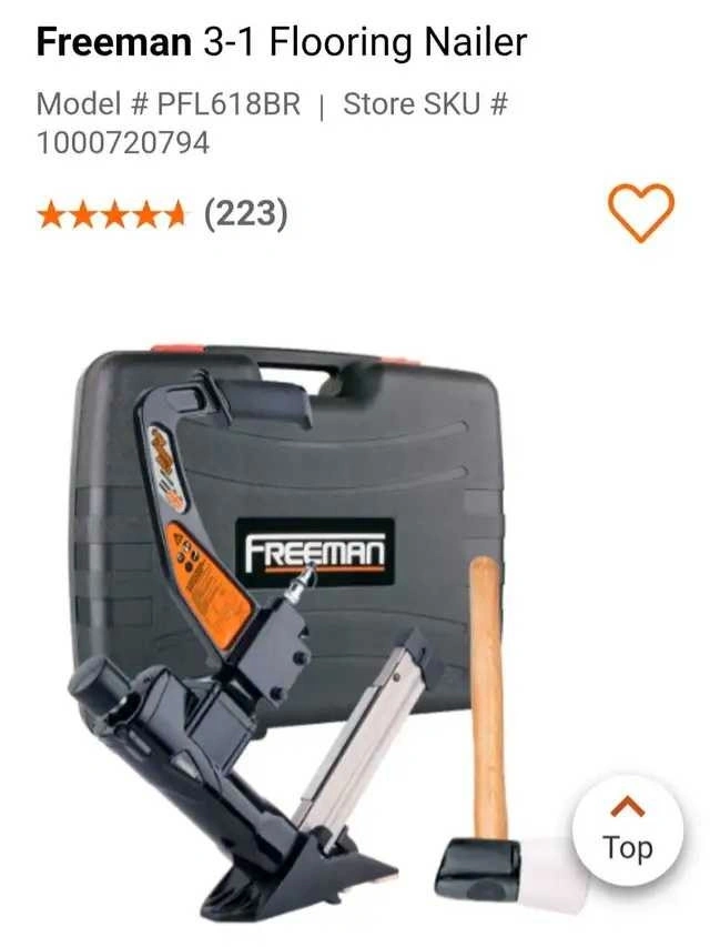 10Used for one project. I'm selling almost new Freeman 3-in-1 flooring nailer, model PFL618BR, perfect for installing hardwood, laminate, and engineered flooring with ease. Specifications: * Model: PFL618BR * Type: 3-in-1 Flooring Nailer * Suitable for: Hardwood, Laminate, Engineered Flooring Brand new at homedepot for $279+tax