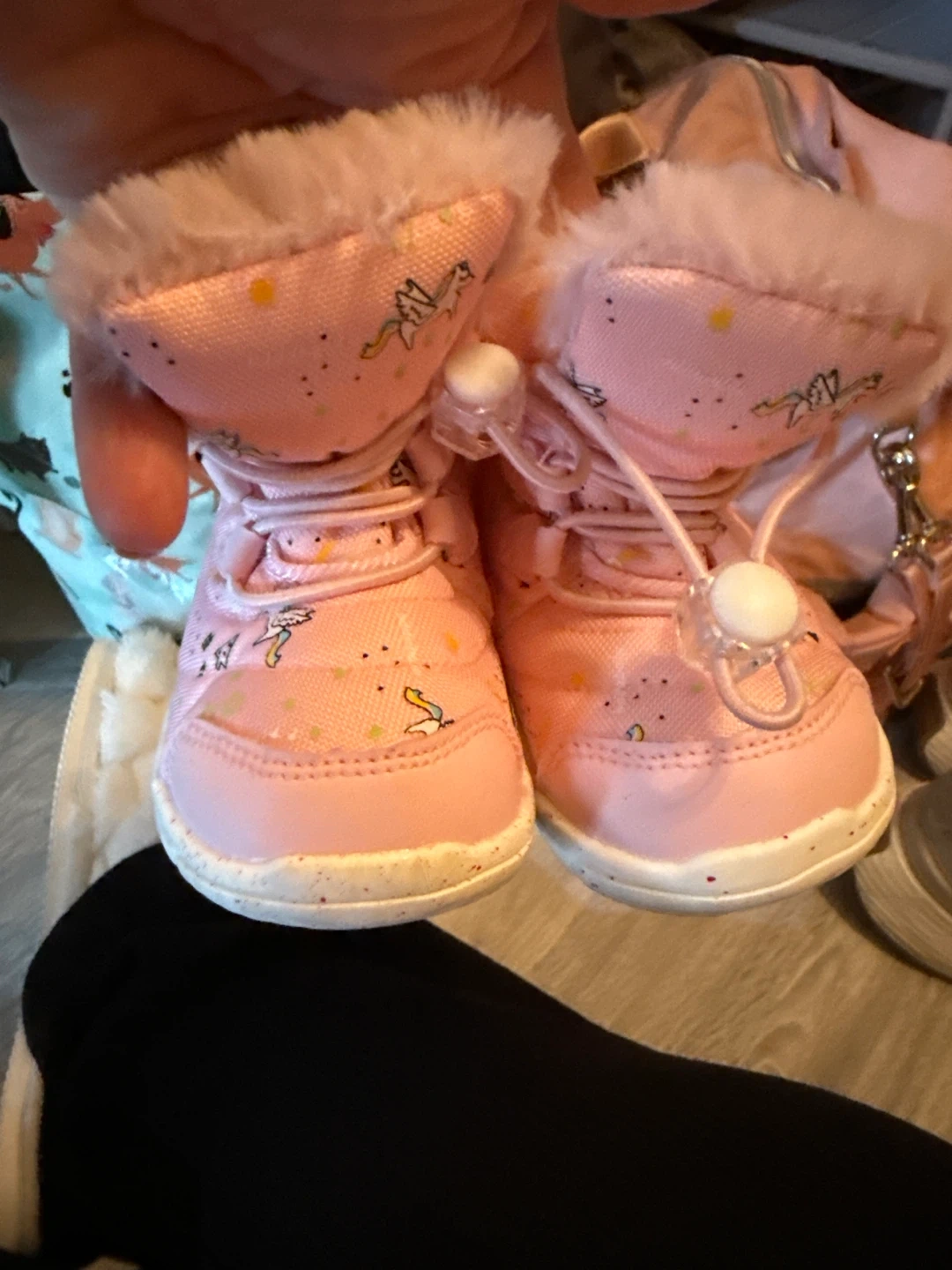 These adorable MORENDL baby winter snow boots are perfect for keeping your little one's feet warm and cozy! They are pink and feature a cute design. The size is 130