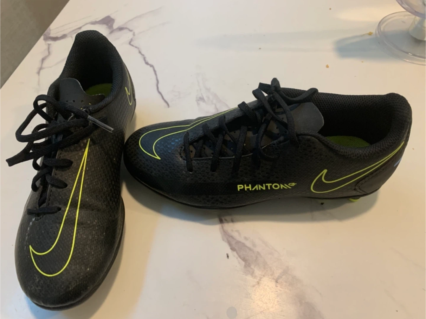 Selling a pair of Nike Phantom soccer shoes in black with yellow accents. Great for indoor or turf play. They're in good used condition and ready for a new home!