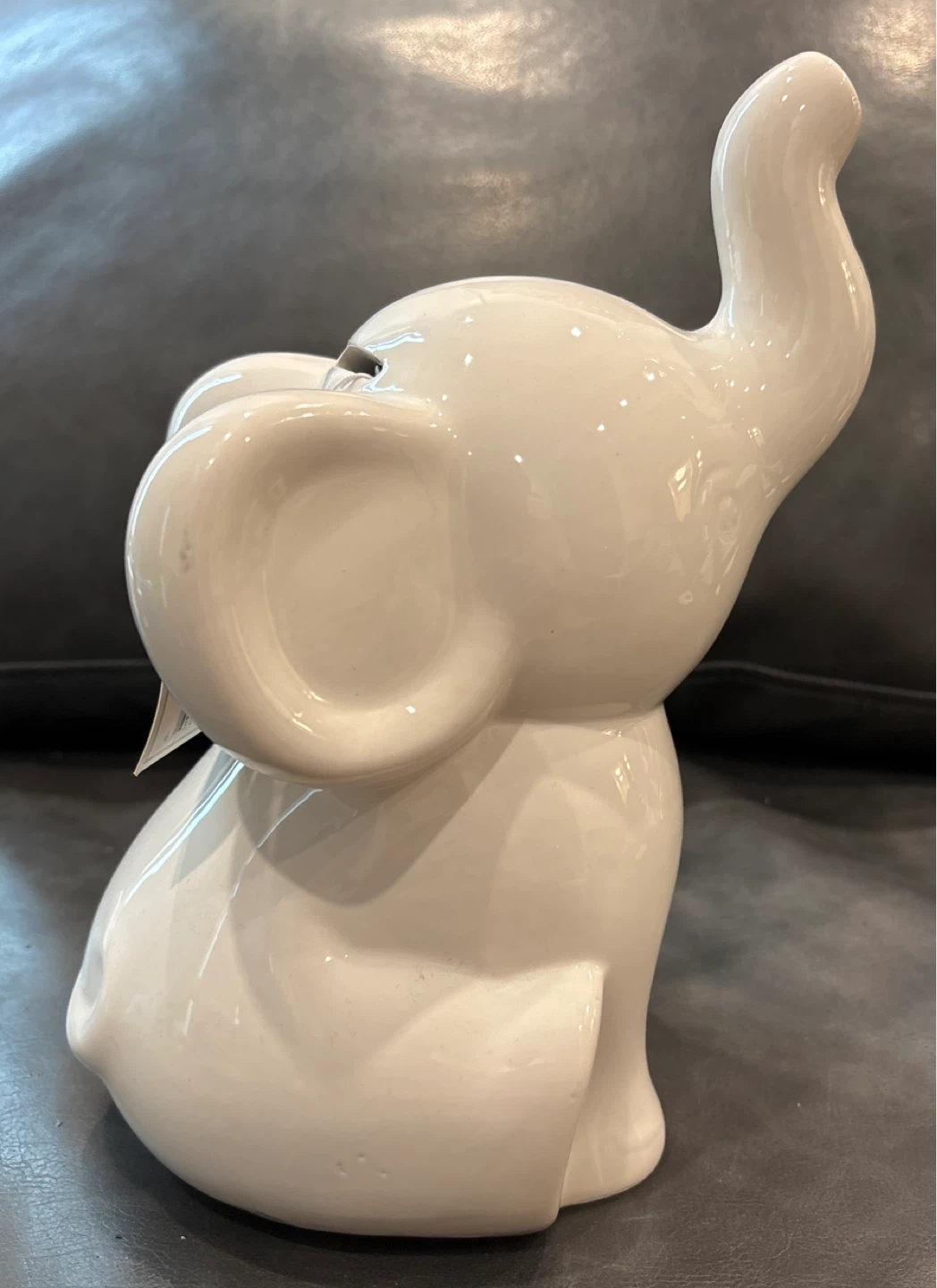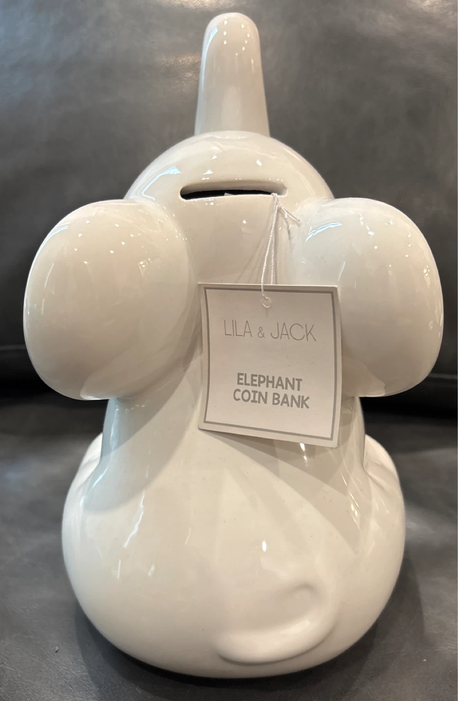 Here's a cute Lila & Jack elephant coin bank! It's in great condition and ready to hold all your spare change. It's white and made of ceramic. Perfect for a nursery or kid's room!