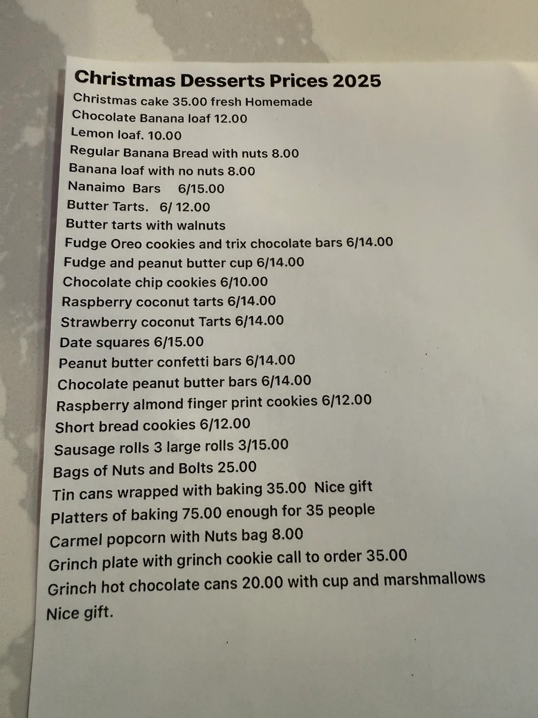 Here's a price list for Christmas desserts in 2025! It includes Christmas cake, chocolate banana loaf, lemon loaf, banana bread, Nanaimo bars, butter tarts, fudge Oreo cookies, chocolate chip cookies, date squares, and more! There are also bags of nuts and bolts, platters of baking, and Grinch-themed items available
