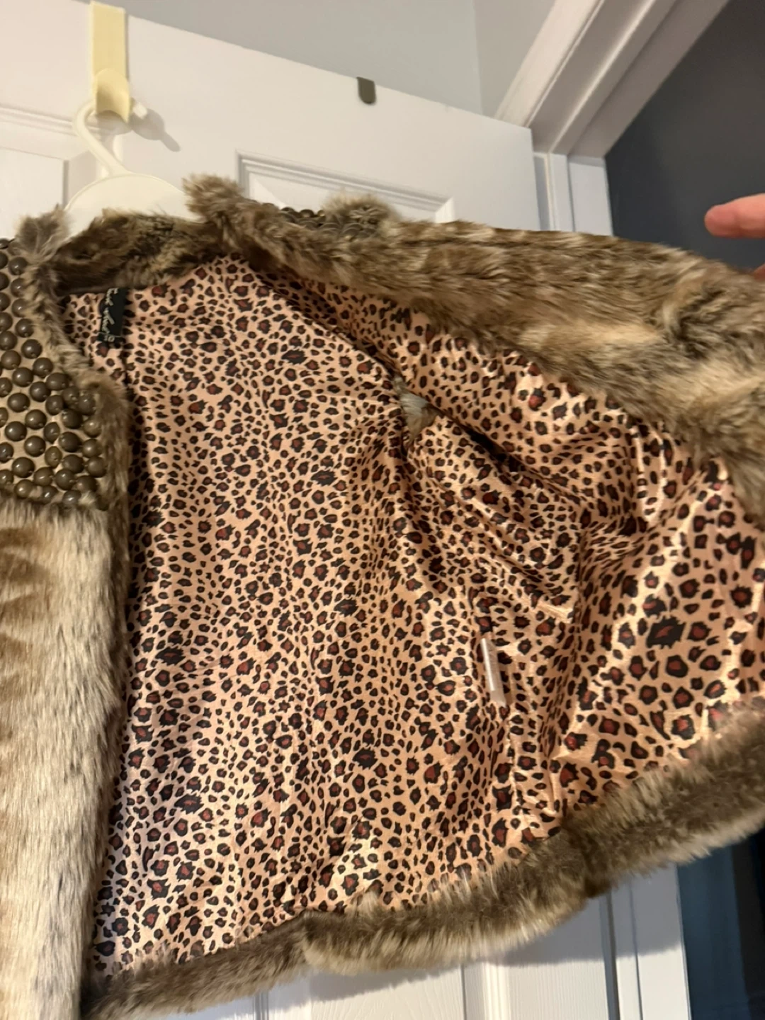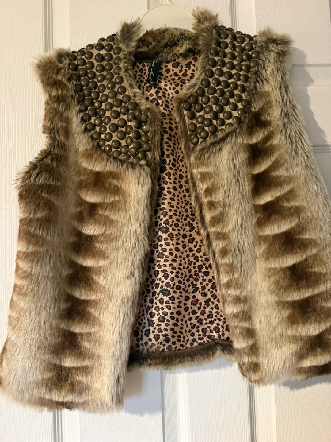 Here's a stylish faux fur vest with unique studded detailing! It features a soft faux fur exterior and a fun leopard print lining. Perfect for adding a touch of flair to any outfit!