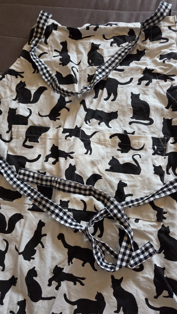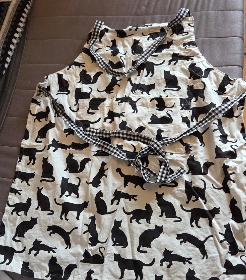 Selling a cute apron with a black cat print on a cream background! It has a handy pocket in front. Perfect for baking or crafting!