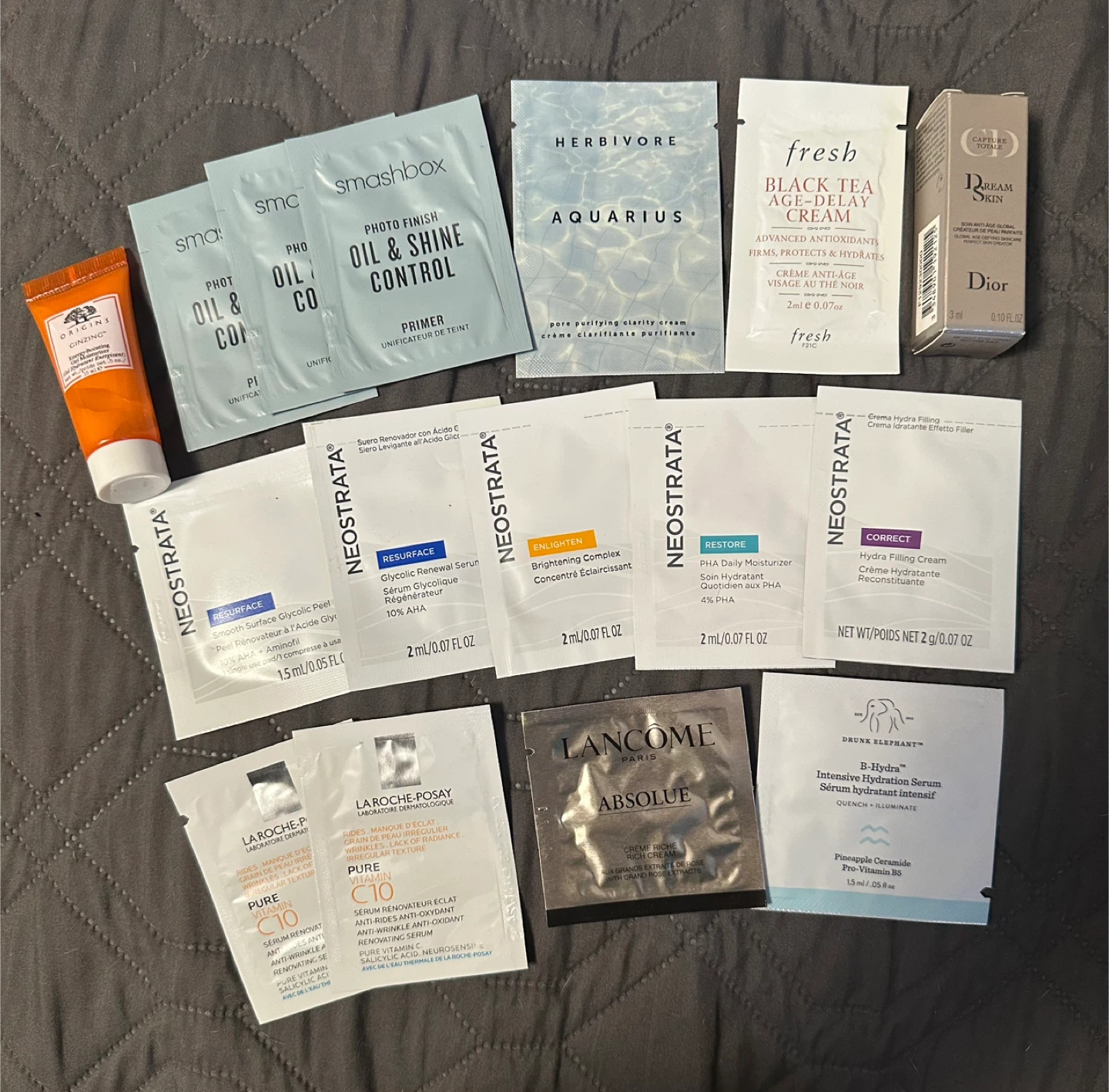 Selling a variety of skincare samples! Includes brands like Origins, Smashbox, Herbivore, Fresh, Dior, Neostrata, La Roche-Posay, Lancome, and Drunk Elephant. Perfect for trying out new products before committing to the full size.