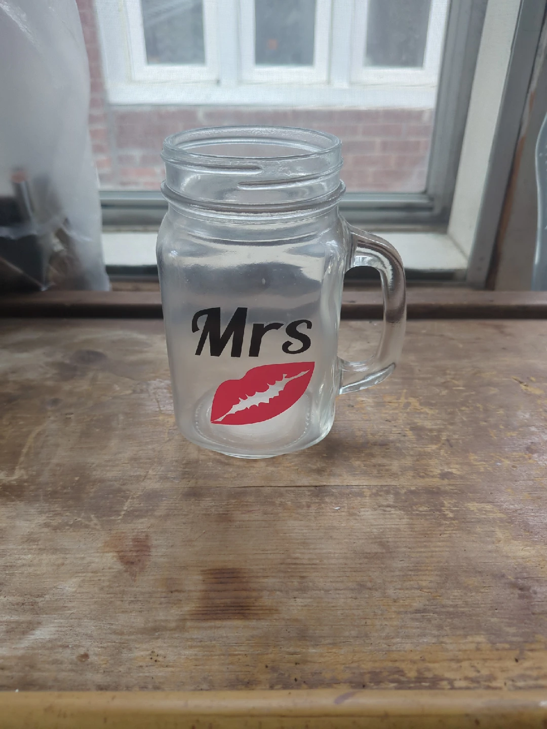 Selling a cute glass jar with a 'Mrs' and kiss design! It's in great shape and perfect for drinks or decor