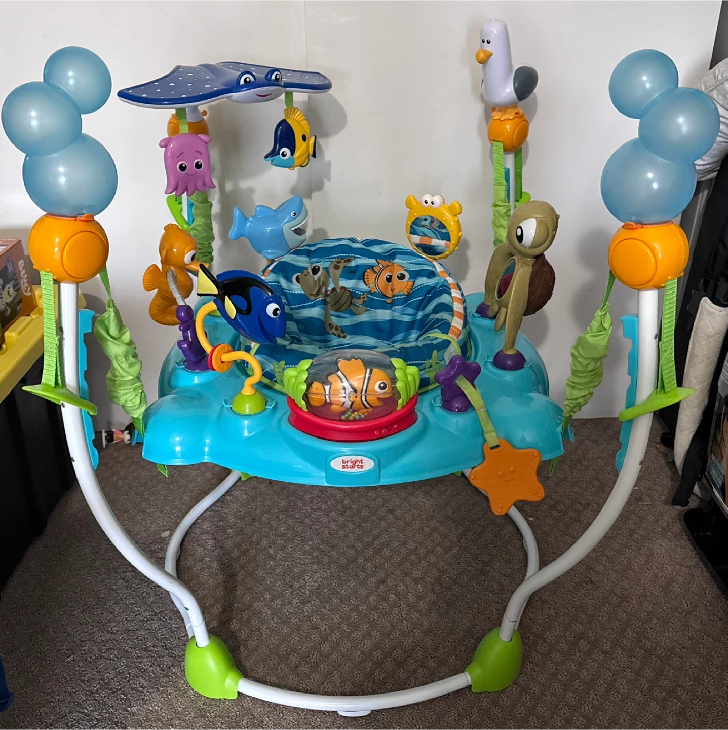Finding Nemo baby jumper with adjustable height on legs. Comes with 2 music and light up toys Nemo and a turtle also has a shark rattle and a star teether.