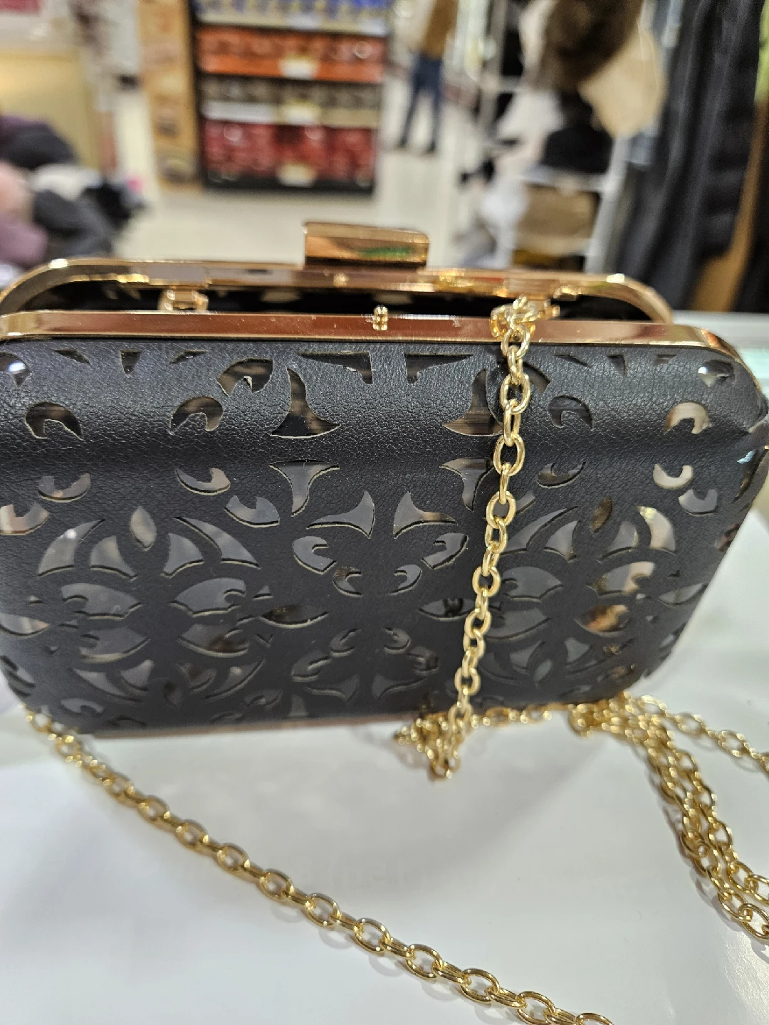 Selling a stylish black clutch with gold accents and a chain strap. It features a unique cut-out design. Perfect for evenings out or special occasions!