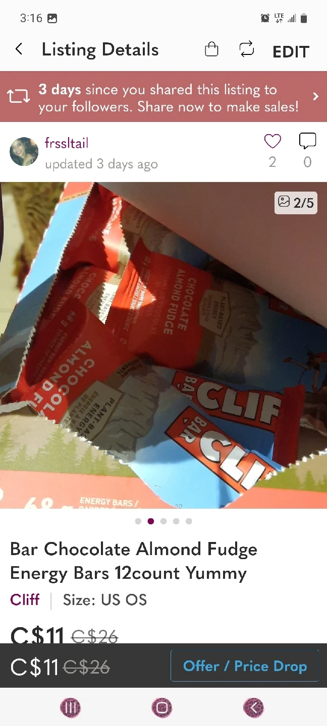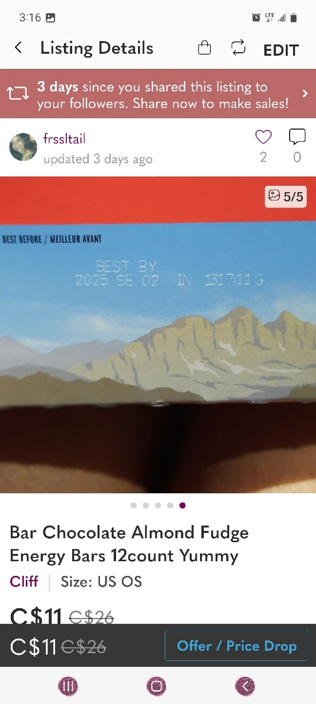 Selling a box of Cliff Bar Chocolate Almond Fudge energy bars, 12 in a box. The box is a little damaged, but the bars are all sealed and fresh! Best before 2025 September 02 location mavis and steels