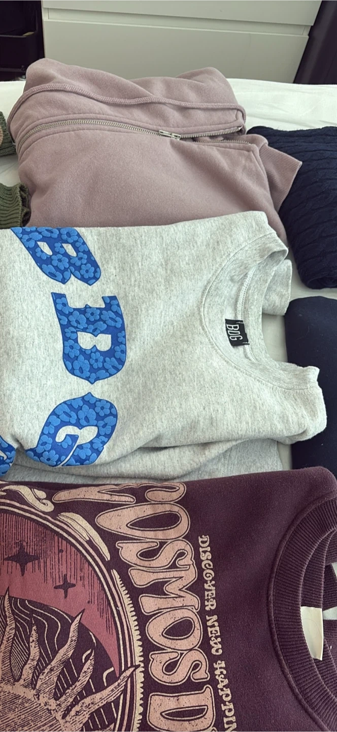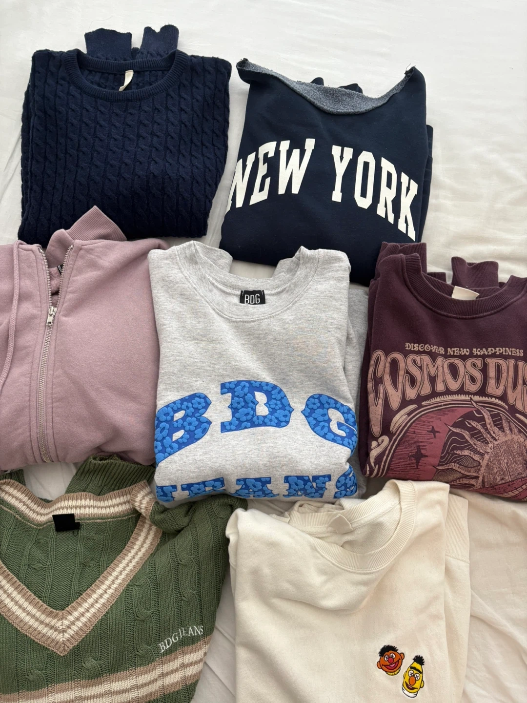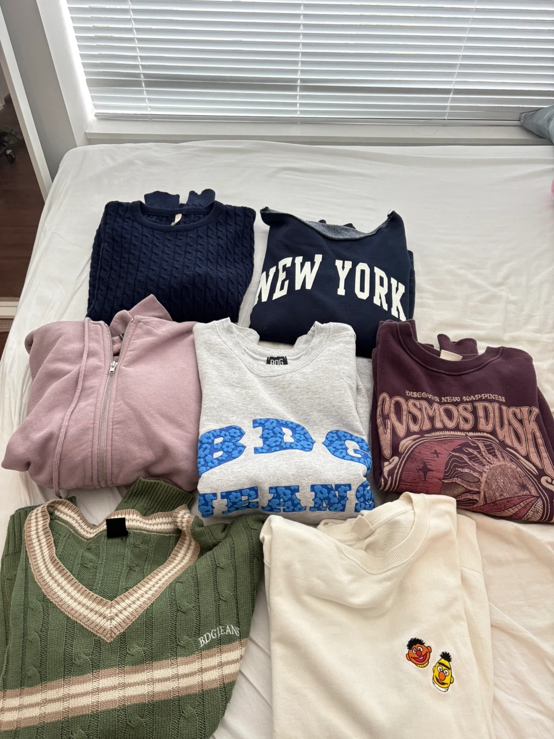 Clearing out a bunch of clothes that don't fit me anymore. There's a variety of sweatshirts from urban outfitters, brandy melville, pull and bear, uniqlo, h&m! They're all in great condition and ready for a new home.