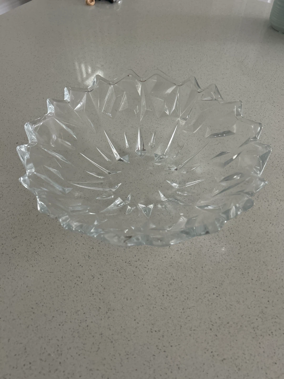 Selling a lovely crystal glass bowl. It's in great condition and would look beautiful as a centrepiece or for serving snacks. The intricate design catches the light beautifully!