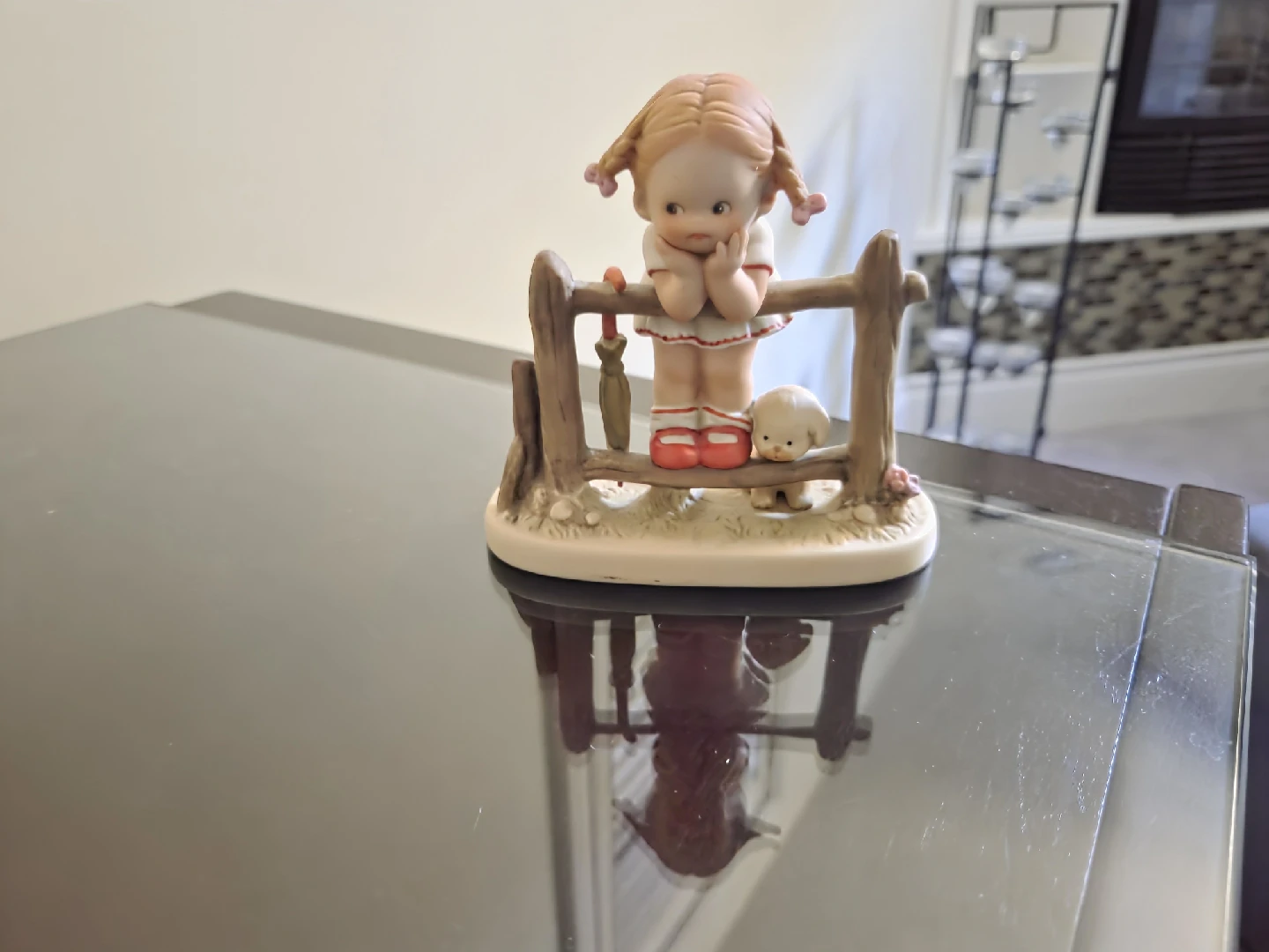 A sweet porcelain figurine of a little girl leaning on a fence with a small dog by her side. It's in great condition and would make a lovely addition to any collection or a charming decorative piece for your home