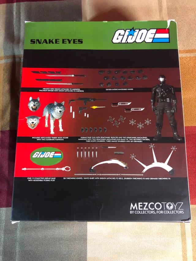 15I am selling an open box Mezco Snake Eyes (custom) from my collection. There are no damages. Note: Timber is not included. Includes 3 new head sculpts, goggles, vest, scarf, and weapon holsters. I am flexible in price and open to and encourage buying multiple items for increased savings. I am not looking for any trades currently. Please inquire if you have questions and or want further details. Note: what you see in the pictures is what you get.