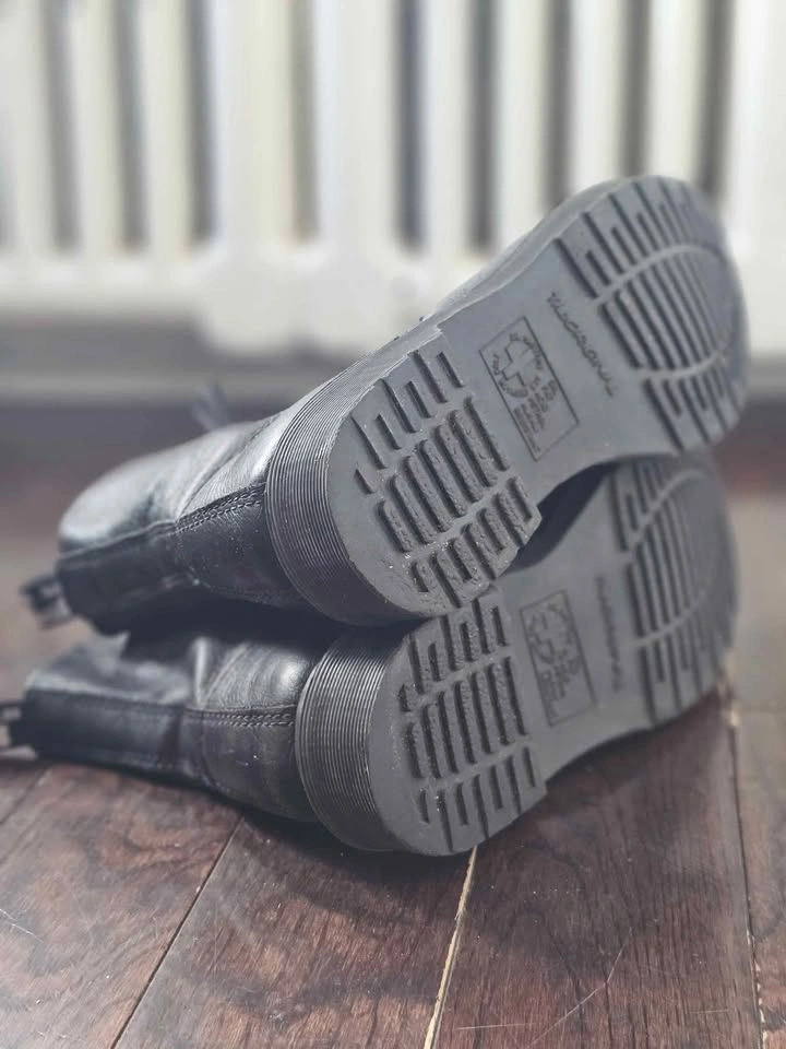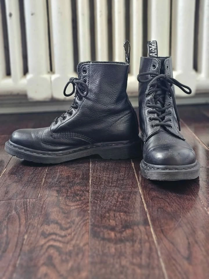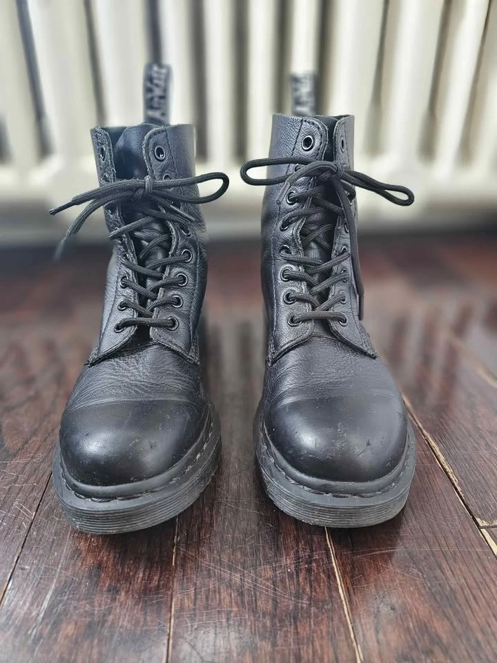 Doc Martens Pascal Mono monochromatic black soft leather comfortable lace-up boots, no breaking in and blisters required. They have black welt stitching where the sole meets the upper, instead of the usual yellow, and black and white pull tabs.