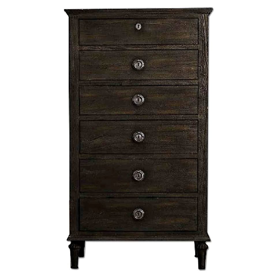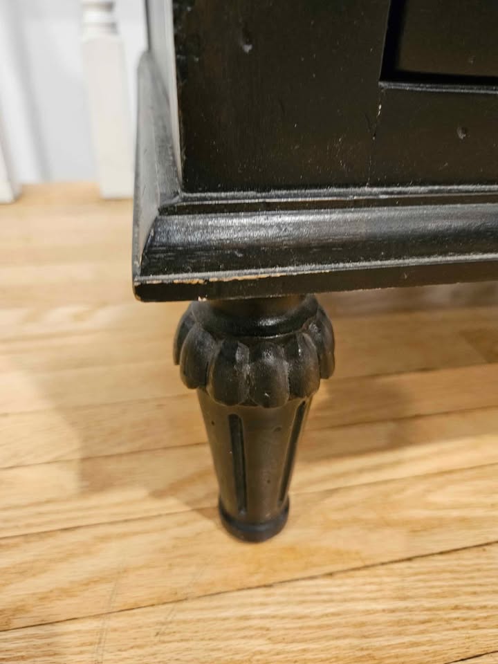 Restoration Hardware Maison Lingerie 6 Drawer Dresser in antiqued black. Inspired by late-18th-century French furnishings. Crafted of solid hardwood and carefully distressed using a hand-applied multistep process to achieve the look of a weathered antique. The tapered, slightly turned legs are fluted, a reference to Classic columns.