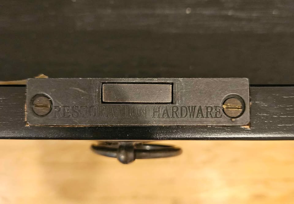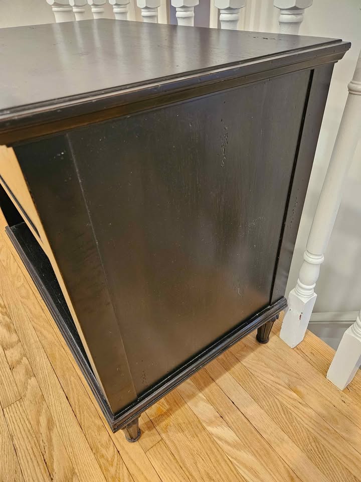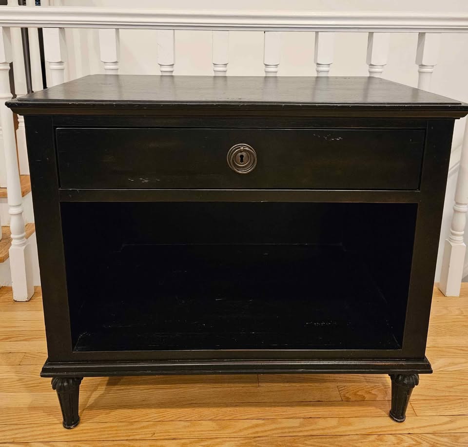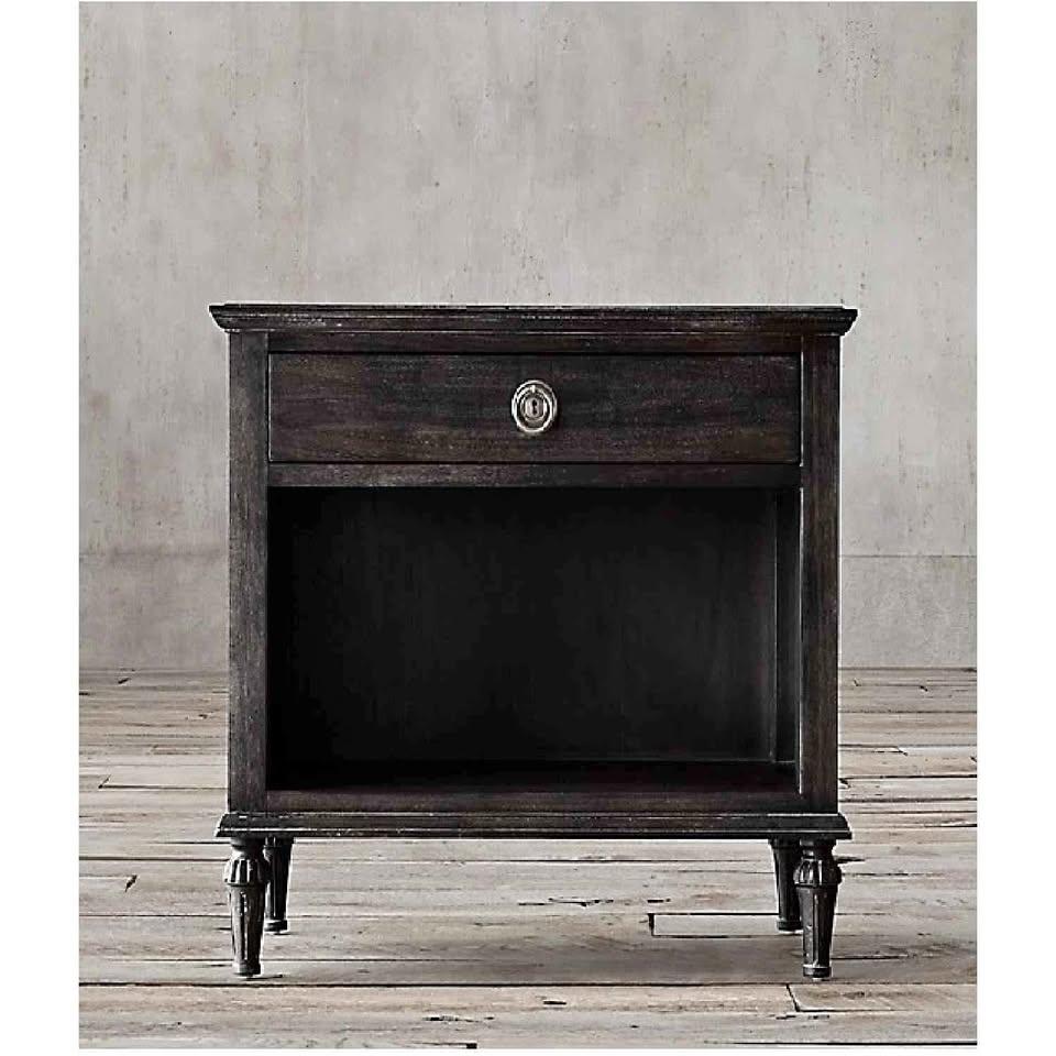 Restoration Hardware Maison Open Nightstand in antiqued black. Inspired by late-18th-century French furnishings. Crafted of solid hardwood and carefully distressed using a hand-applied multistep process to achieve the look of a weathered antique. The tapered, slightly turned legs are fluted, a reference to Classic columns. Drawer has functional keyhole. See my other ads for matching dresser and closed nightstand from same collection.