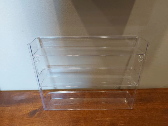 Racks are pre-loved but are in excellent condition, no mounting hardware is included. I have 9 available but can adjust the listing to sell in lots of 2 or more. Clear Racks, with build-in mounting holes on reverse 3 levels per rack Measures 11.07" x 2" x 8.8"; BPA Free Racks are a bit dusty due to storage please keep that in mind when purchasing. Racks are NOT self standing are are meant to be mounted on the wall, therefore they may appear slightly twisted prior to mounting. I have had all of these mounted and they are fine. Holds a variety of shape and size nail polish bottles, see photos for examples. Nail polish is for demonstration only and is NOT included with this sale. Can be used in the kitchen for spice or in the bathroom for toiletries also! Perfect for a Professional Nail Salon or home studio Pickup ONLY - Dallas Area, Kamloops If you are unable to get to Dallas please do not respond to this ad FIRM