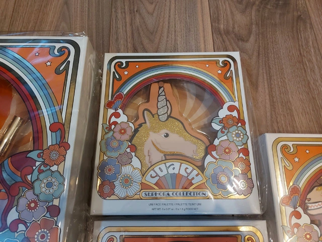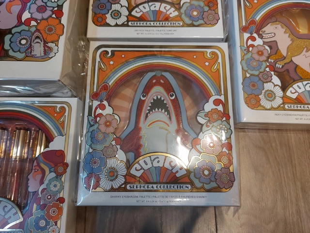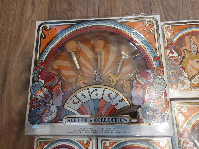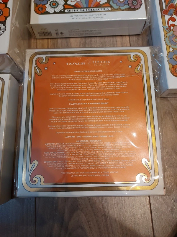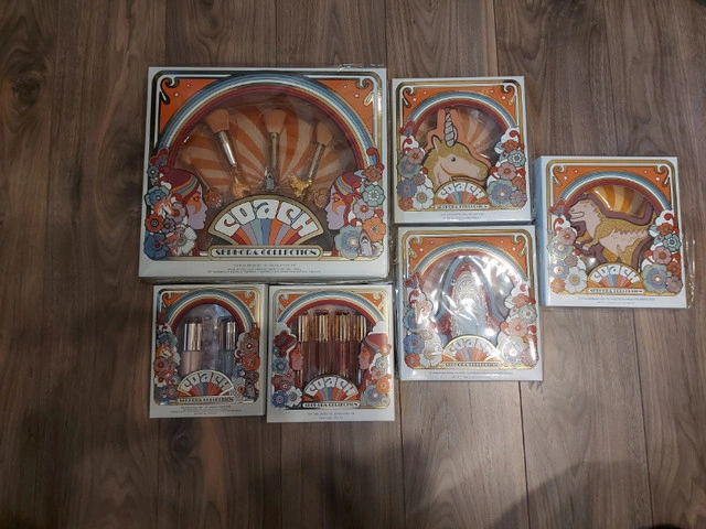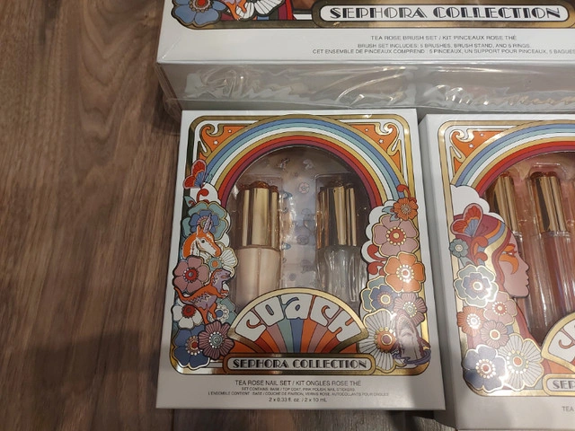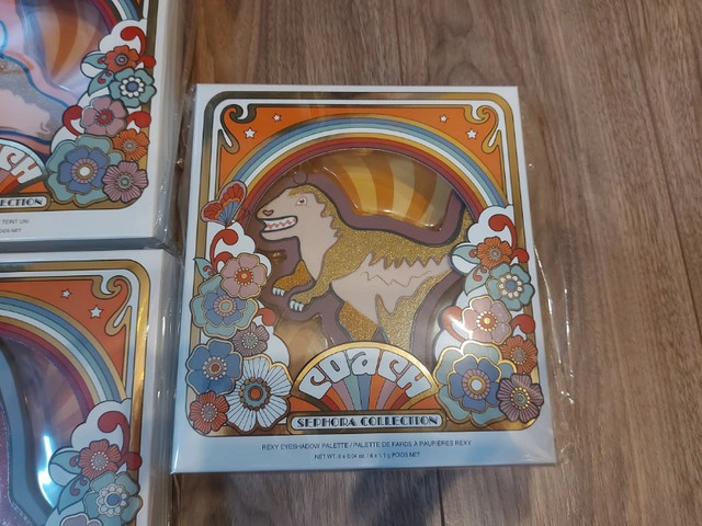 COACH x Sephora Collection (minus the Eye Gels) in original plastic, Never opened. Lip Gloss & Nail Art Set Never Came with plastic covers Brush Set is Beautiful! A limited-edition brush set created in collaboration with Coach, featuring five face and eye brushes housed in a brush stand with detachable rings One has popped out of the plastic (See photos) and I didn't want to open the box to fix this. Brush Handle: 3.9 inches / 99 mm Powder brush Angled blush brush Highlight brush Shadow brush Crease brush Stand 5 x Adjustable rings Uni Face Palette - 3 x 1.9g Headlined by the magical mascot Uni, this all-in-one face palette features a bendable blush, radiant highlighter and matte bronzer In shades Rose - Clay - Bronze Sharky Eyeshadow Palette - 6 x 1.1g Beloved Coach mascot Sharky sparkles on this palette, featuring six versatile eyeshadow shades in soft mattes, metallics, and shimmers Rexy Eyeshadow Palette - 3x 1.1g inspired by the leader of Coach’s mascots includes a mirror and eyeshadows featuring warm hues and soft shimmery shades Tea Rose Lip Gloss Set - 4 x 4.6ml 4 lip glosses with a range of shades from dusty pink to scarlet reds (Collectors Item as collection is older) Tea Rose Nail Set - 2x 10ml Comprises a bottle of pretty pink nail polish, an all-in-one base and topcoat, as well as nail stickers with images of Coach’s mascots to decorate your nails with (Cannot guarantee functionality of nail Set given age) Pickup ONLY - Dallas Area If you are unable to get to Dallas please do not respond to this ad FIRM Sold as a SET ONLY Unable to hold without etransfer in advance