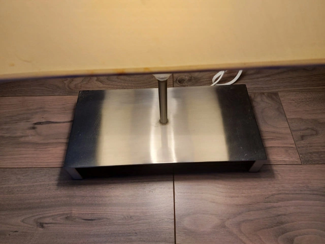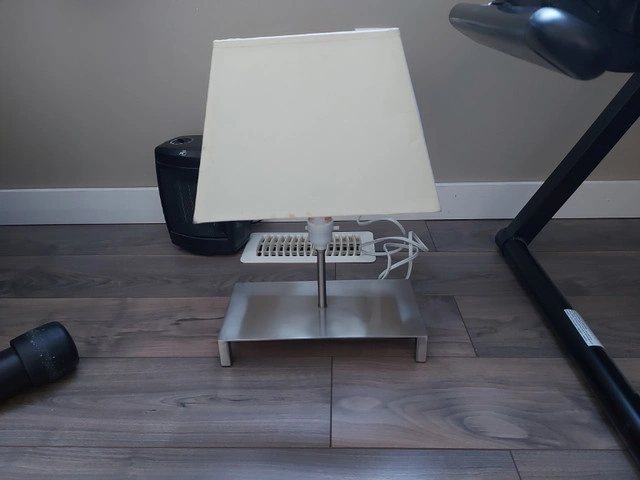 Lamp is in great used condition. Base of lamp is a brushed silver and does have a few surface scratches due to use and storage. Shade is a thick paper like material and does have some damage, which doesn't affect the use of the lamp (see photos). Shade provides a natural dimming effect. Switch on/off at base of fixture and cord is quite long. See photos for measurements. Bulb not included, just showing that lamp works. Pickup ONLY - Dallas Area. If you are unable to get to Dallas please do not respond to this ad.