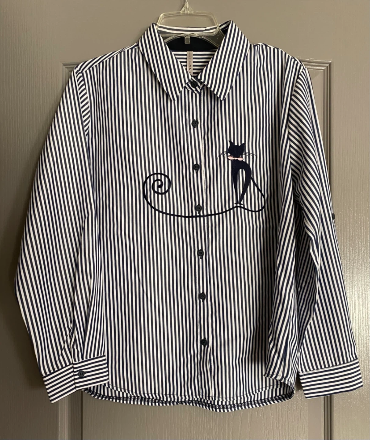 This is a striped button-down shirt, featuring a cute cat embroidery design. This Korean shirt is perfect for adding a touch of whimsy to your wardrobe. The shirt has a classic button-down style with long sleeves and a comfortable fit. It's in brand new condition and ready for a new home!