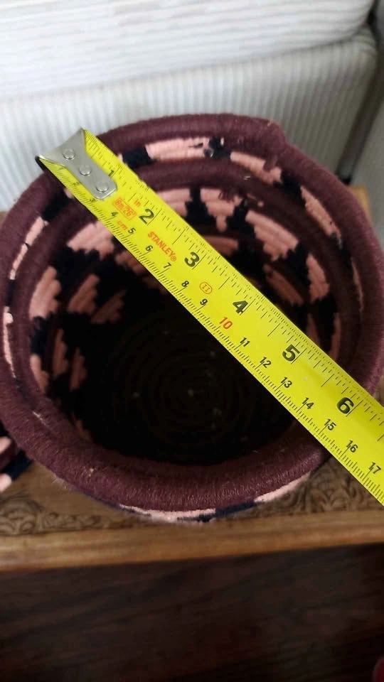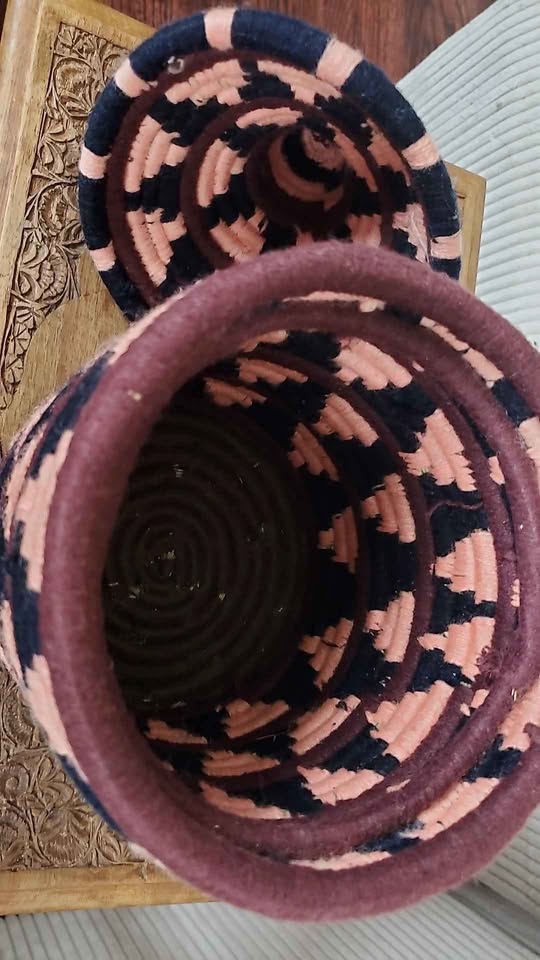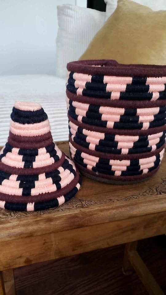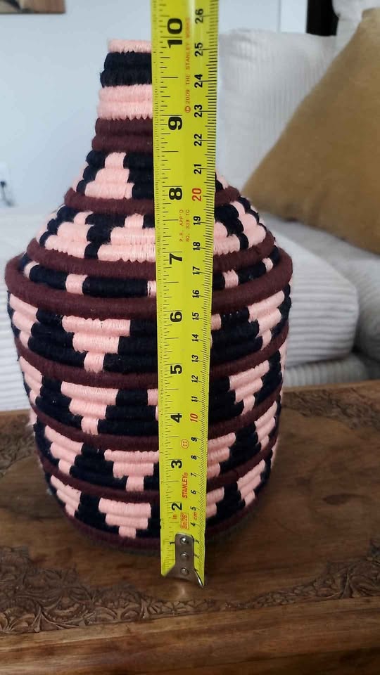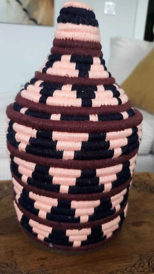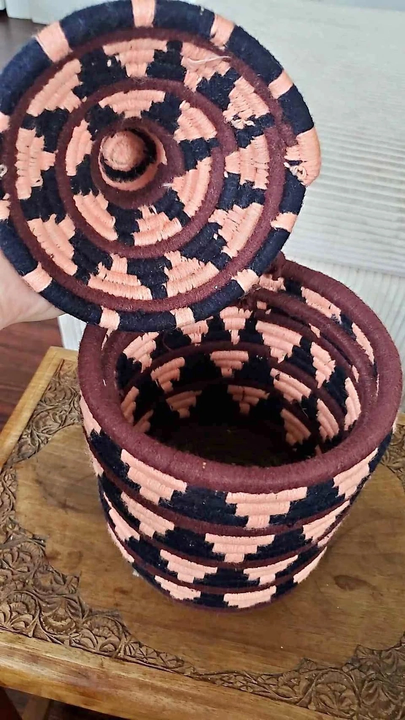 Excellent condition, used decoratively on shelf, smoke and pet free home. Berber artifact. Handmade, handwoven. Peach and burgundy coloring. Can be used as a catchall pot for miscellaneous items, toilet paper, bread, tea, etc. Pattern is unique and beautiful. Aprox 10inches tall with lid. Beautiful!