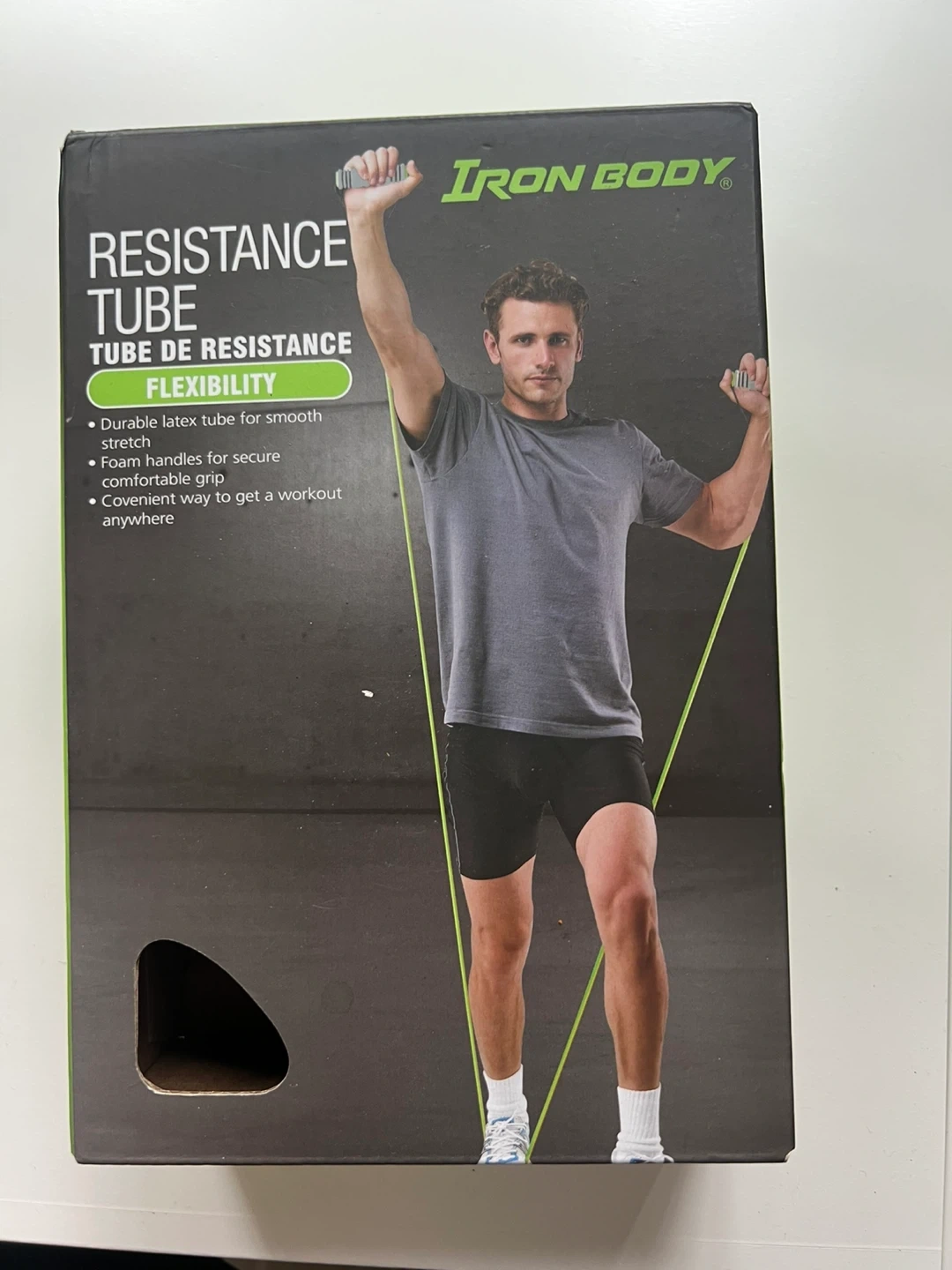 68Selling an Iron Body resistance tube. It's designed for flexibility and comes with a durable latex tube for smooth stretching. Also features foam handles for a secure and comfortable grip, making it a convenient way to get a workout anywhere