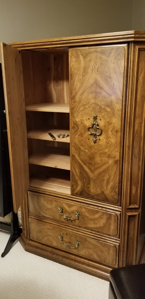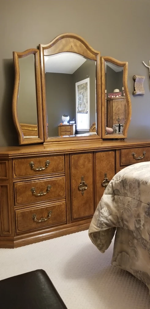 Beautiful vintage oak bedroom set by designer Gerard Collins! Includes an armoire with shelves and drawers, a 9 drawer dresser with a tri-fold mirror, queen headboard with bedfrane. The wood has a lovely, unique grain pattern and antique-style hardware. Cedar interior. Perfect for adding a touch of classic elegance to your space. One handle on armoire needs to be reattached.