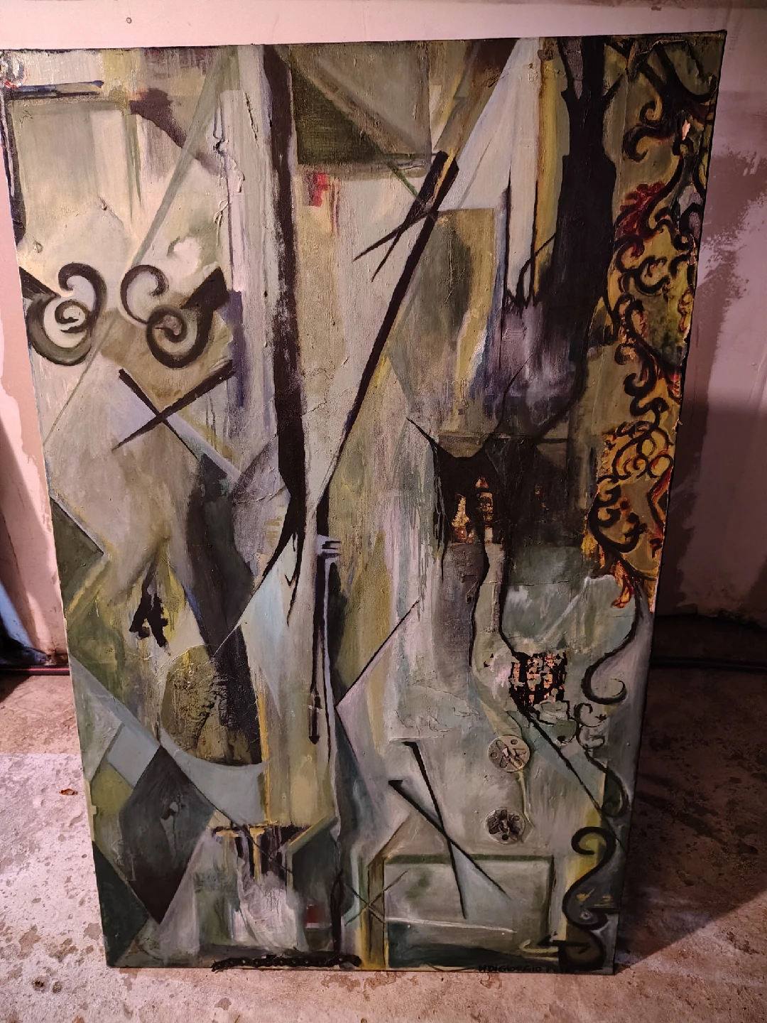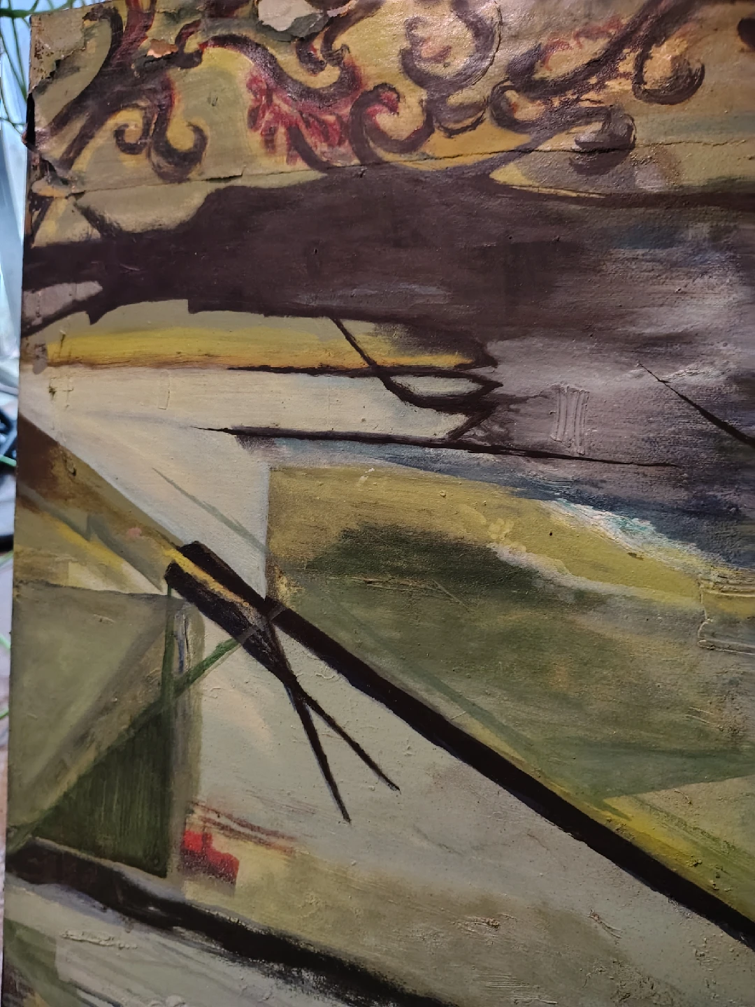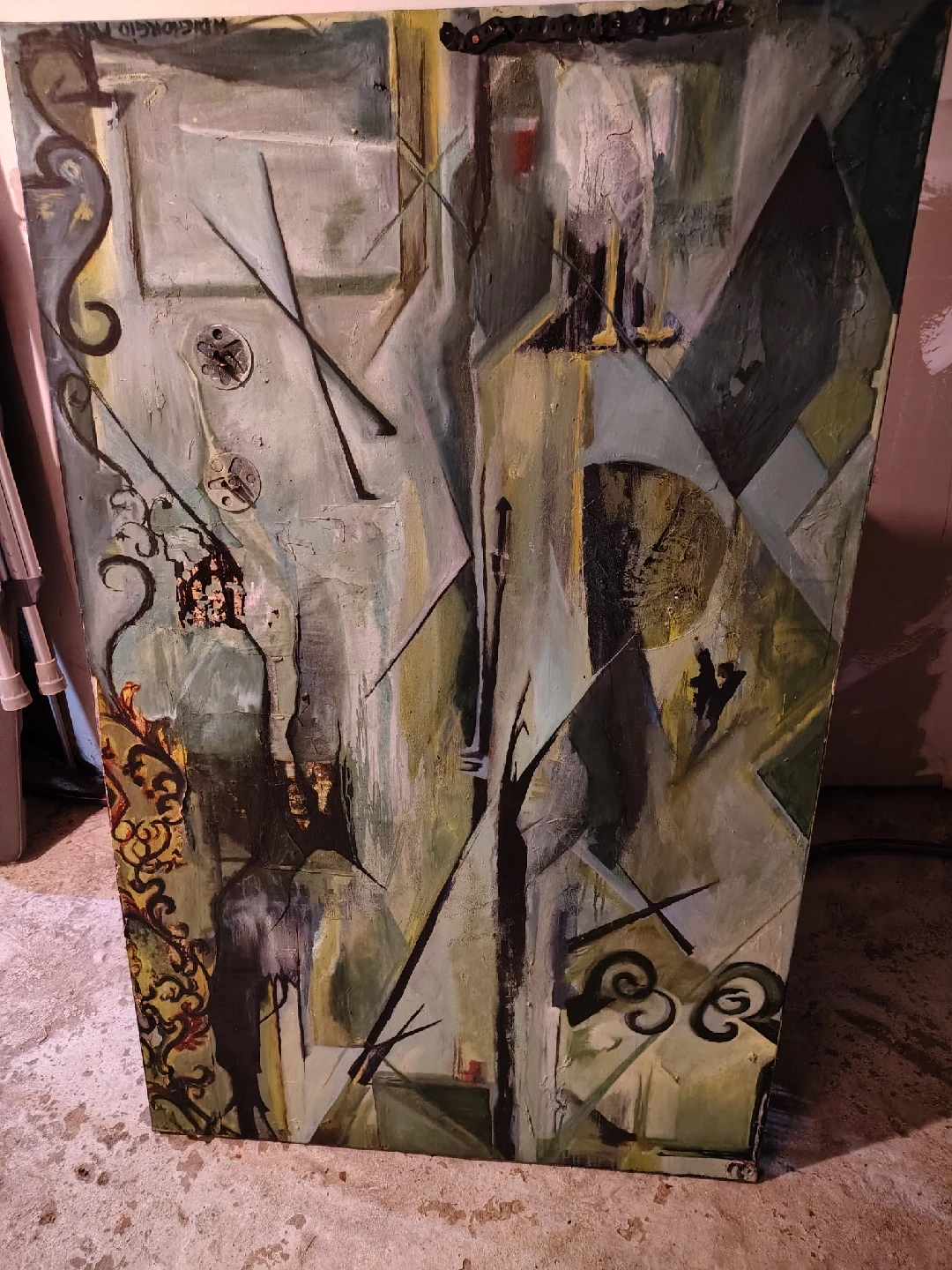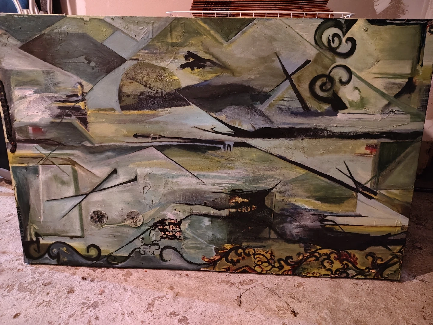 What makes this piece especially unique is that you can hang it four different ways as the photos show— sideways or lengthwise — and they all look great! It truly feels like four paintings in one! The textured details, including bike chain and metal elements, make it an intriguing and conversation-starting artwork.