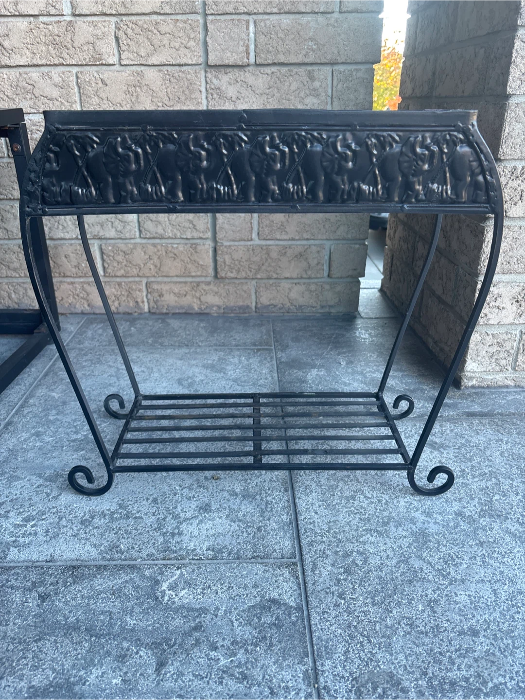 This is a charming black metal plant stand, perfect for adding a touch of elegance to your home or garden. It features a unique design with a row of elephants along the top edge, adding a whimsical touch. The stand has a sturdy metal frame and a lower shelf for extra storage or display space