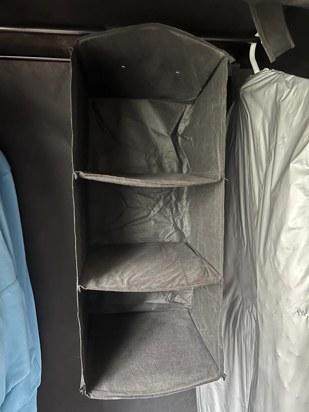 68Selling a handy black hanging closet organizer! It has three shelves to help you keep your closet tidy and make the most of your space
