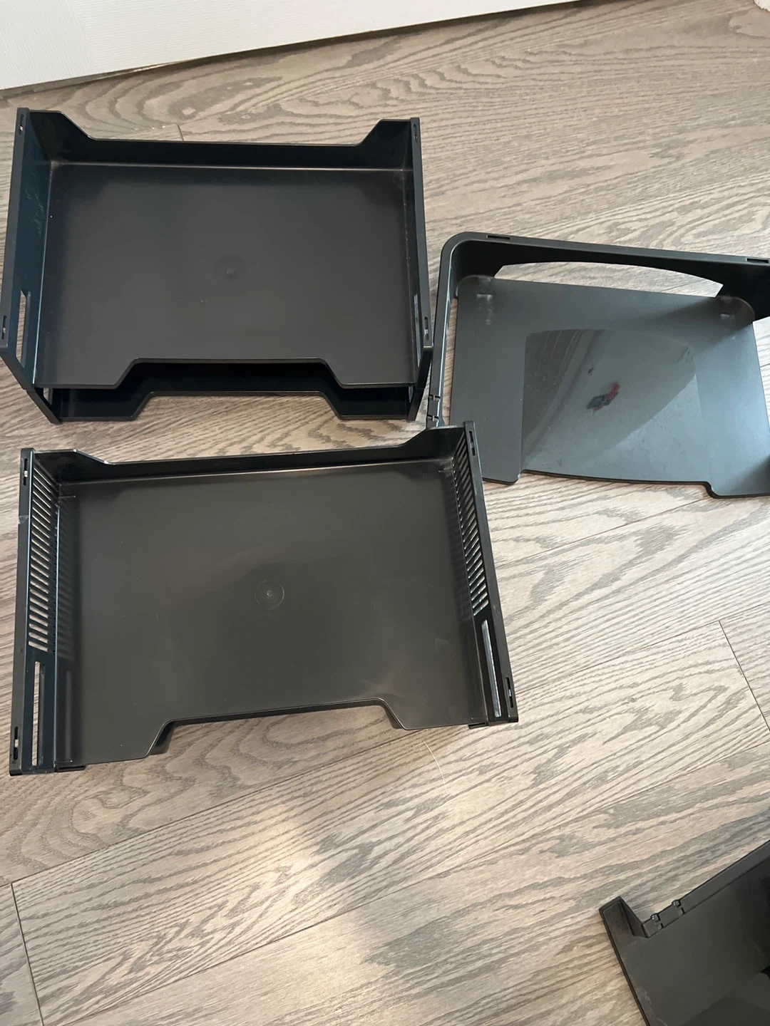Selling 5 black plastic storage bins or trays. They have some signs of use, but are still in good condition for organizing your space. Great for decluttering!