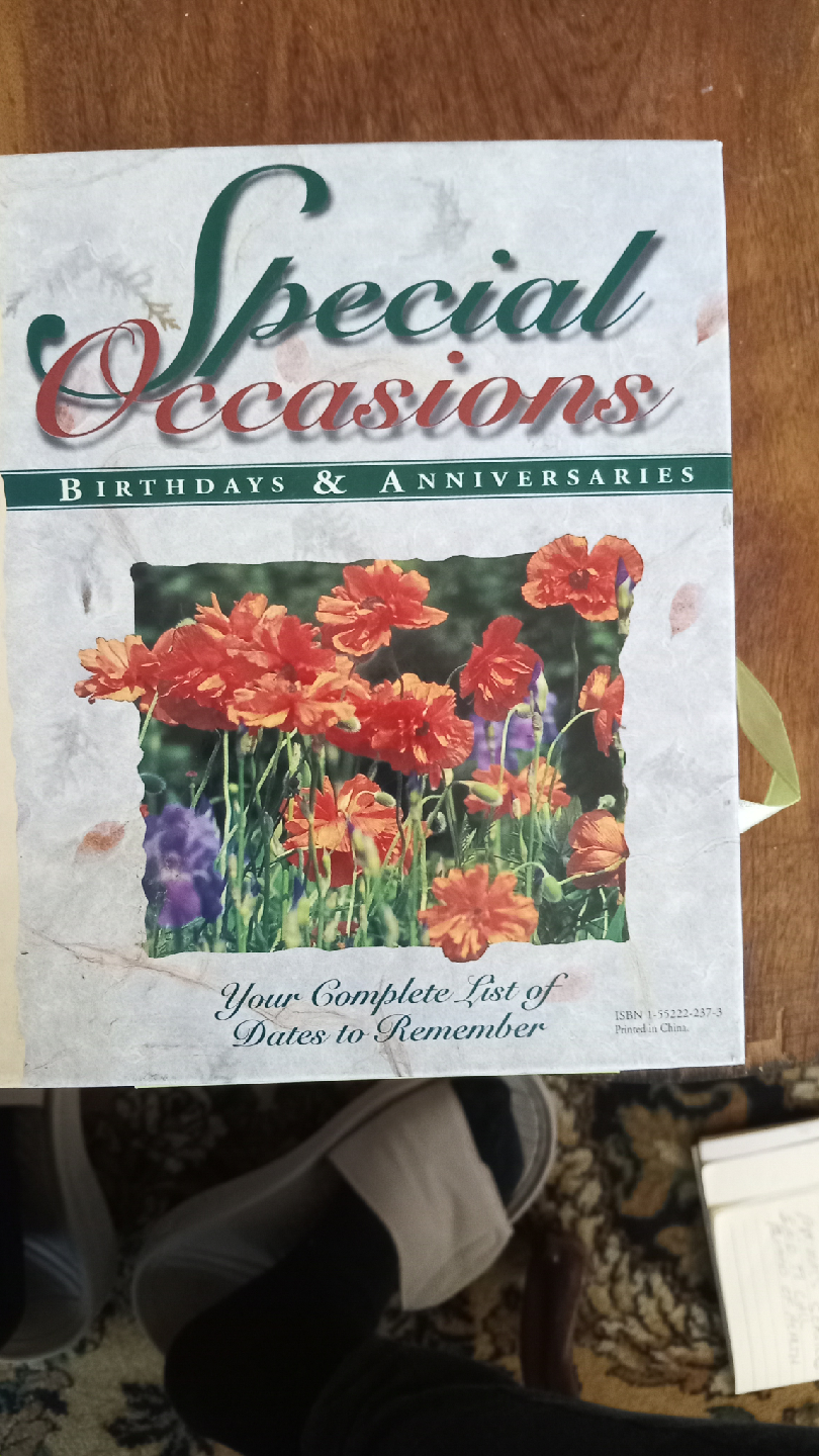 I'm selling a book titled 'Special Occasions Birthdays & Anniversaries'. It's your complete list of dates to remember! Also included is an address and telephone book. Perfect for keeping track of important dates and contacts. There are names on some of the pages