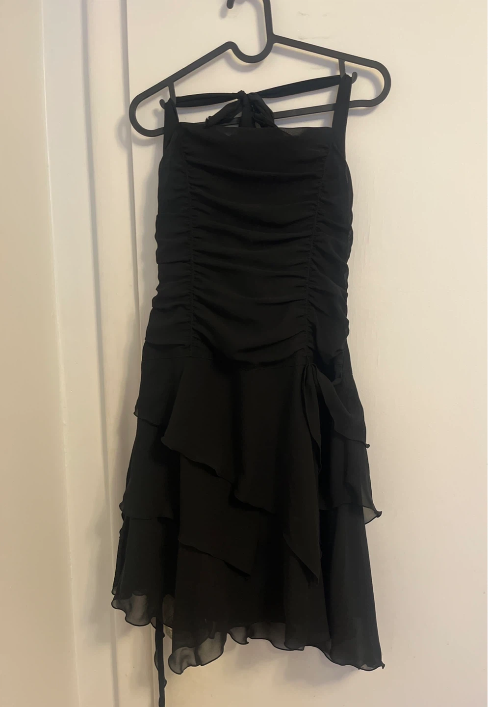 Selling a cute black mini dress! It features a halter neck tie and a ruffled skirt. Perfect for a night out or a special occasion. Perfect outfit for Halloween. I can give you bigger discounts the more you buy.