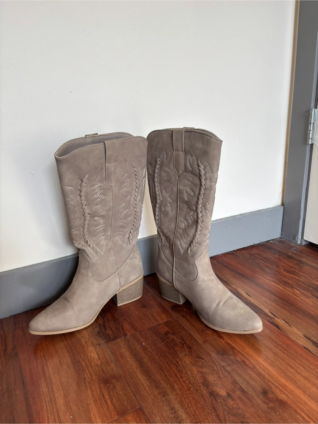 Selling a pair of cowboy boots in a neutral taupe color. They are a size 10 and feature decorative stitching. Perfect for adding a touch of western style to any outfit!