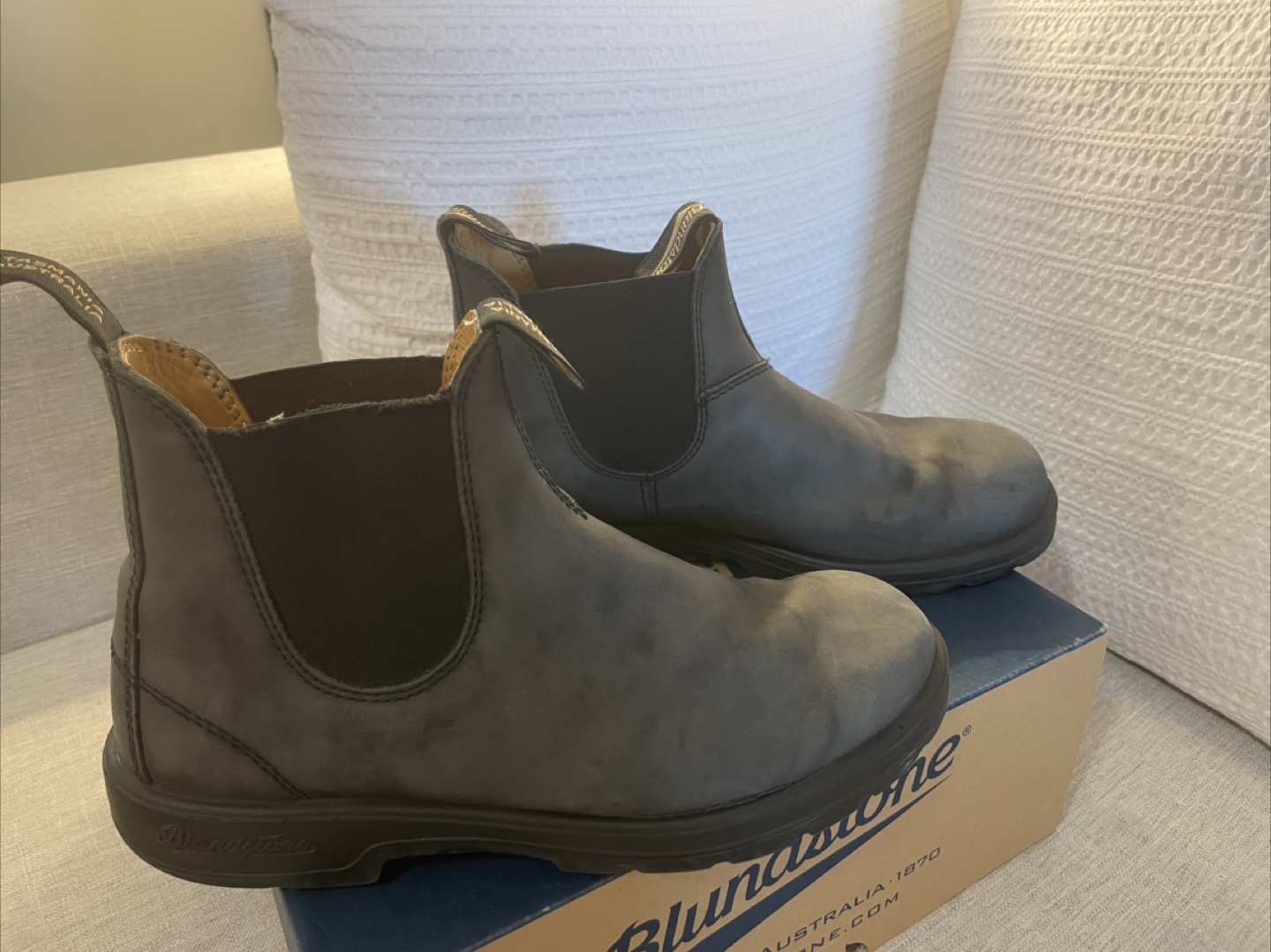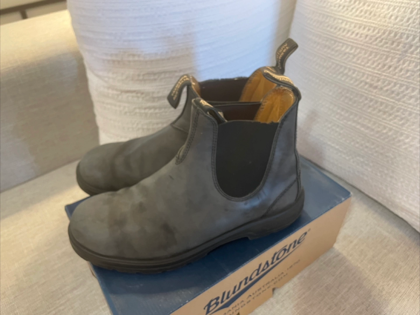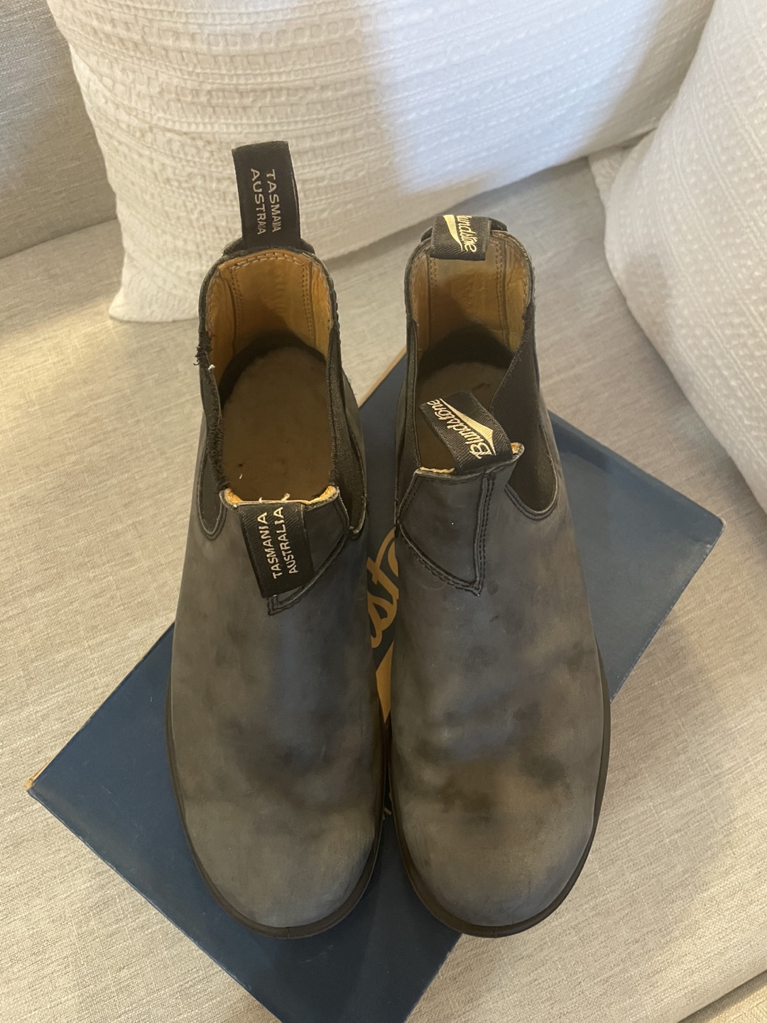 Selling a pair of Blundstone 587 Chelsea boots in size 9. They're in good condition with some signs of wear. Comes with the box.