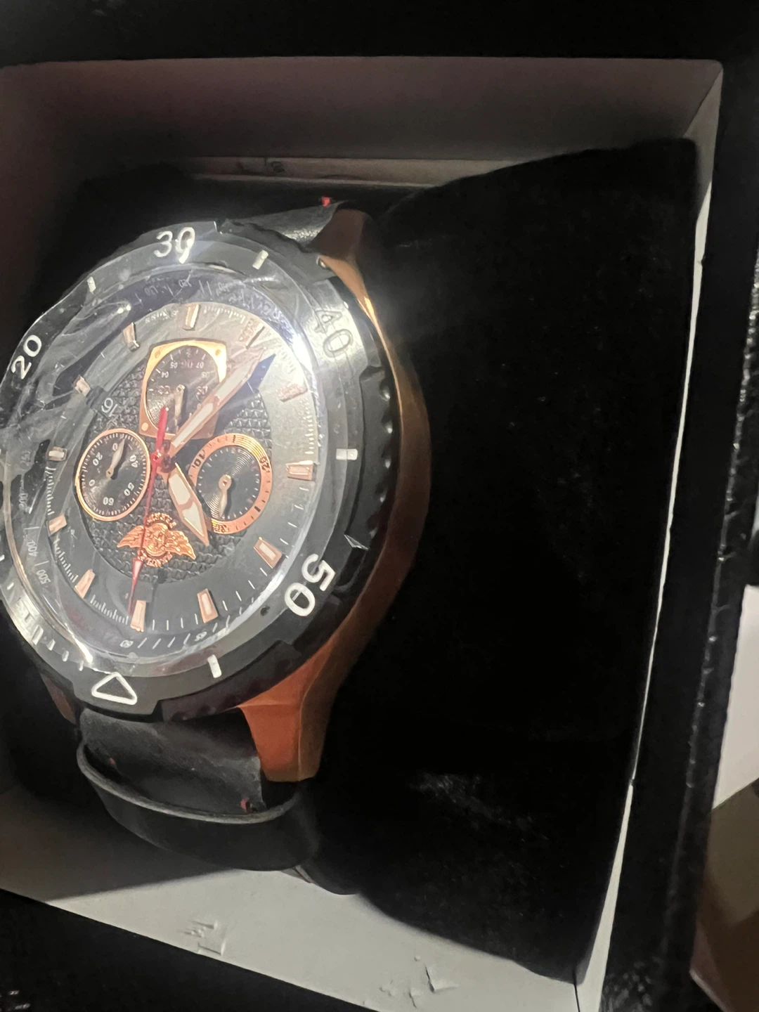 Selling a Zentler Freres Rodan watch. It comes in its original box. The watch has a black face with rose gold accents and a black leather strap. It's in great condition!