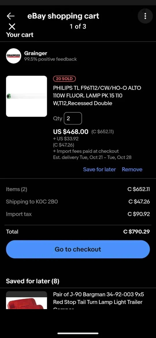 15Selling two Philips TL F96T12/CW/HO-O Alto 110W fluorescent lamps. They are 94 inches long. Originally bought for $652.11 Before tax never used it