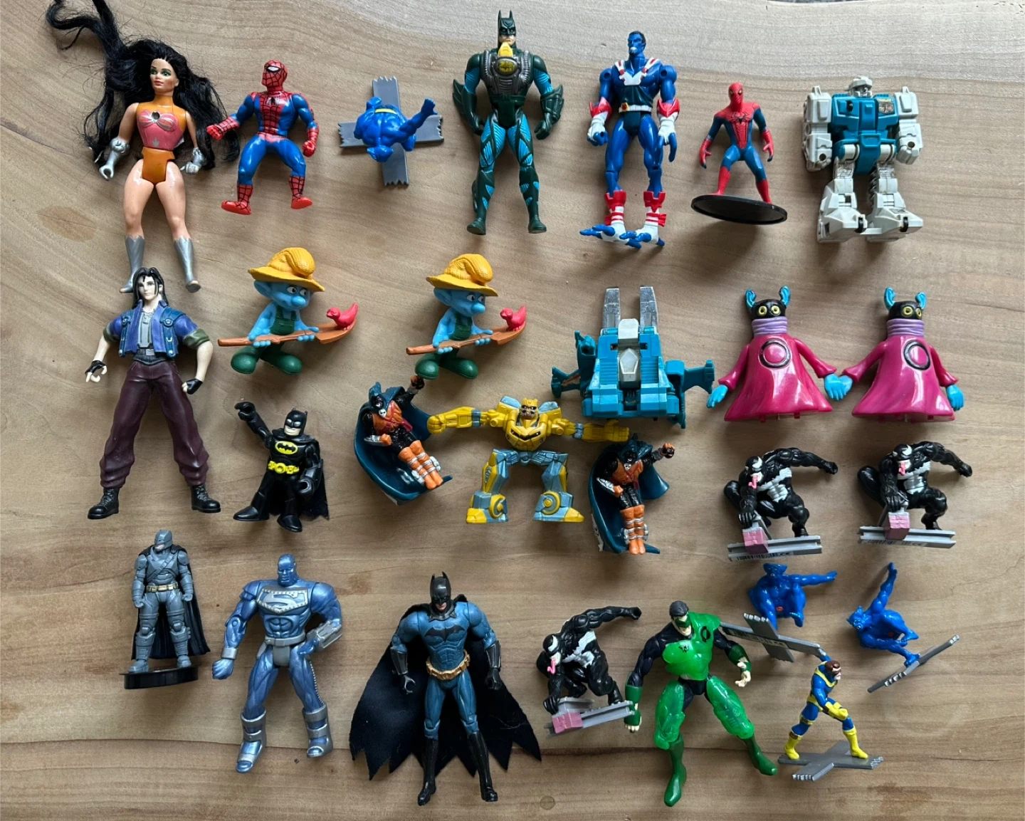 15Selling a mixed lot of action figures. Includes Teenage Mutant Ninja Turtles (TMNT), Batman, and Spiderman figures. Great for collectors or kids who love superheroes!