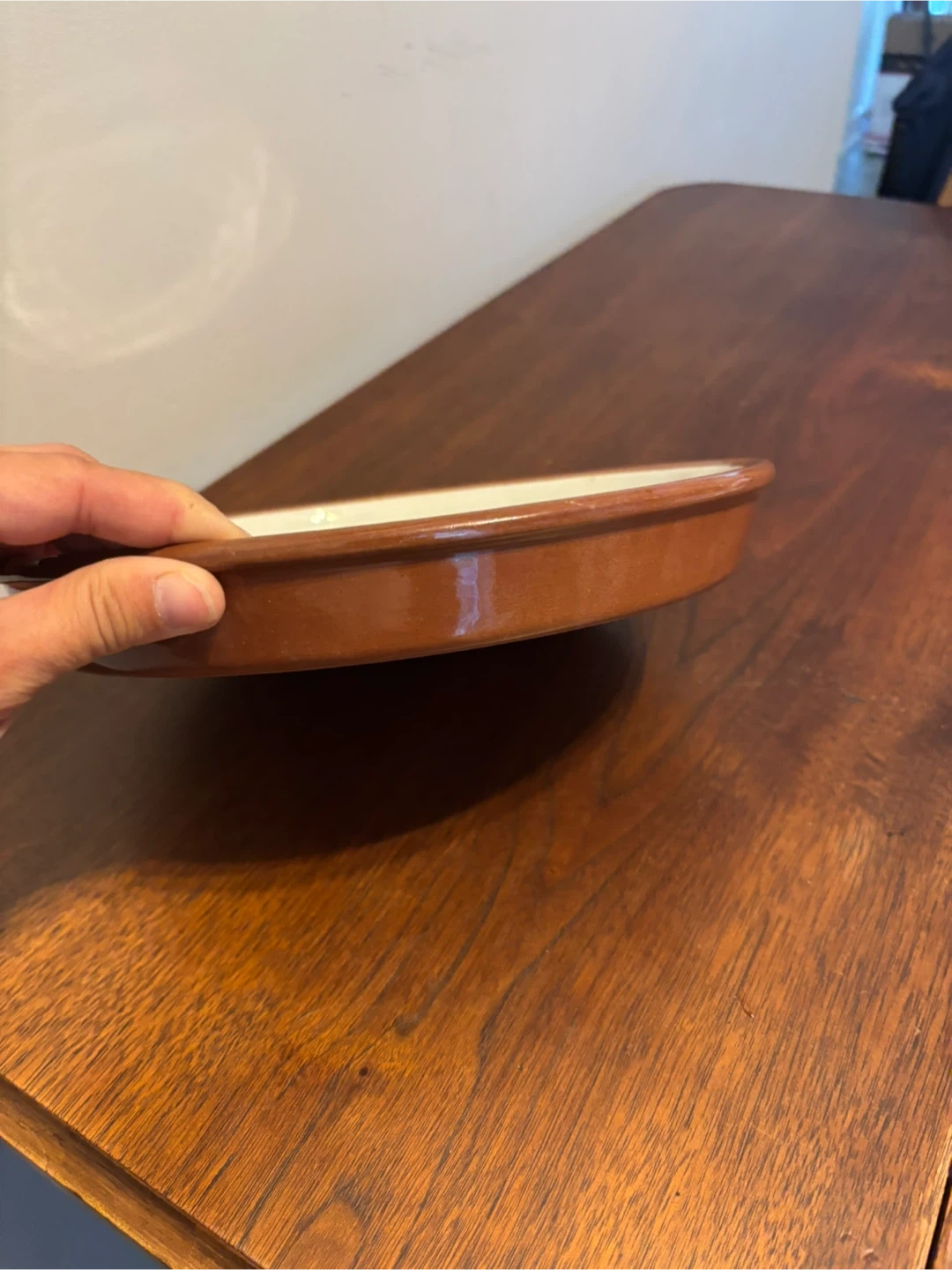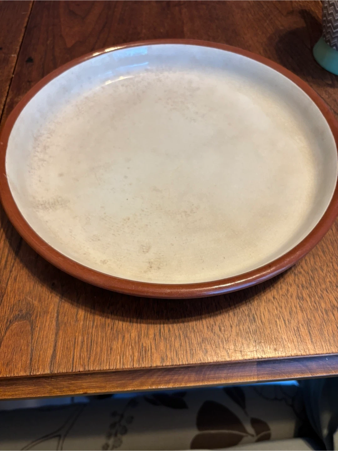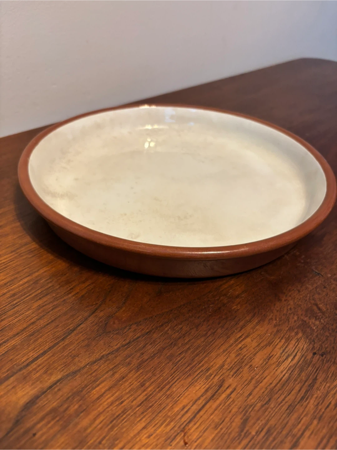 Selling a vintage pottery plate (Tera cota). It has a cream-coloured centre that’s glazed and a brown rim. There are some signs of use given its age, but overall it's still in good shape! 10” wide and 1 thick. Cash only.