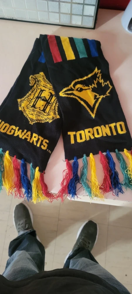 Show your love for both Hogwarts and the Toronto Blue Jays with this unique scarf! It features the Hogwarts crest and the Blue Jays logo. Perfect for any fan!