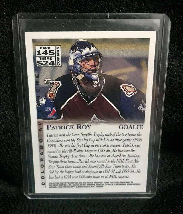 Selling a 1995-96 Topps Finest Patrick Roy Colorado Avalanche hockey card, #1. This is a great collectible card featuring the legendary goalie, Patrick Roy, in his Colorado Avalanche attire. A must have for any hockey card collector! While this card has been loved, it's time for it to find a new home where it can be appreciated. Keep in mind that if the ad is still posted, the card is still available, so no need to ask!