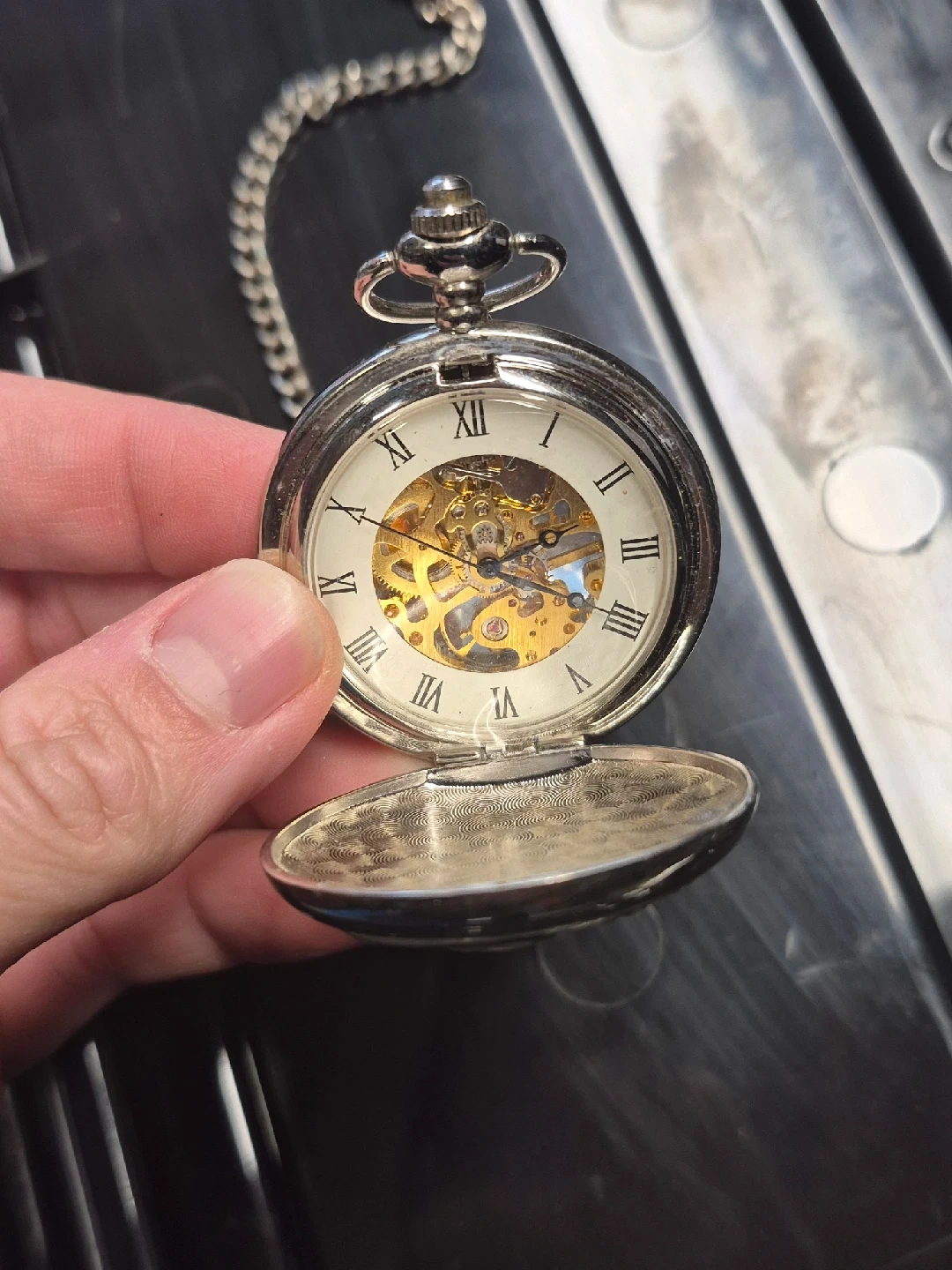 Selling a vintage-style silver pocket watch with a chain. It features a detailed design on the cover and a classic Roman numeral display. The watch has a unique mechanical movement visible through the face. A great accessory for adding a touch of old-world charm to any outfit