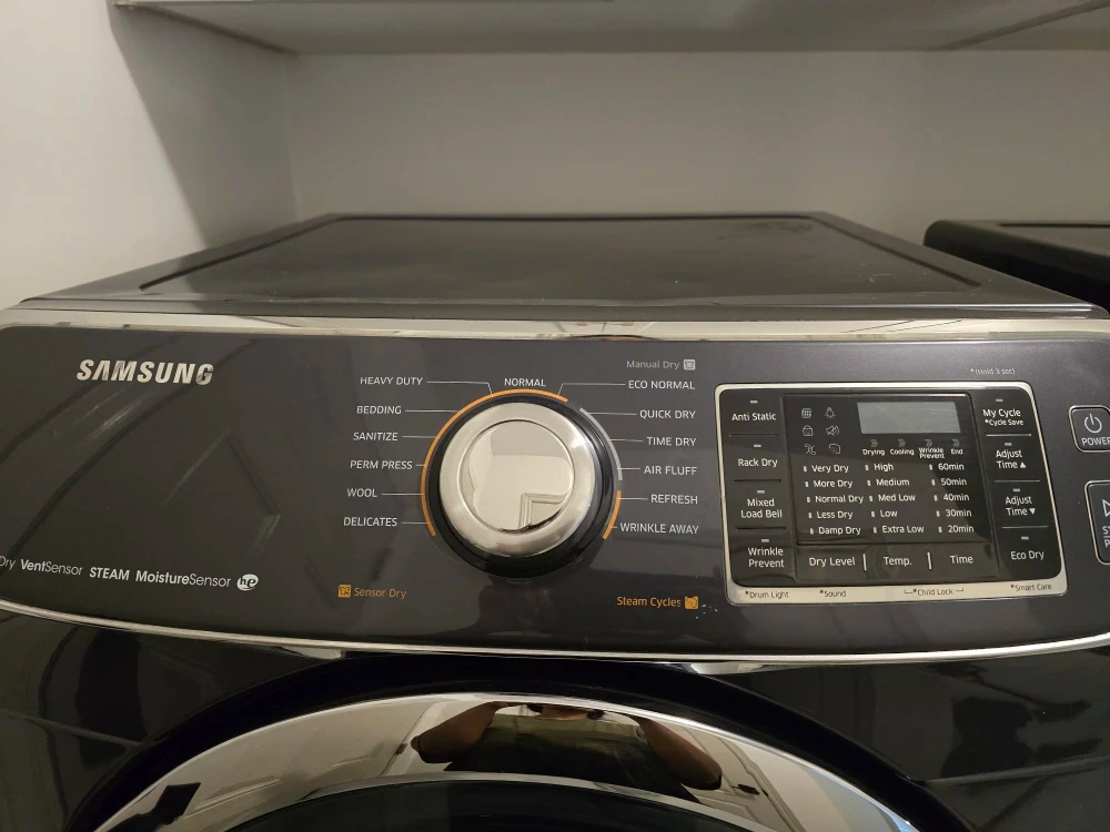Selling a Samsung dryer with steam and moisture sensor features! It has various drying cycles including heavy duty, bedding, sanitize, perm press, wool, and delicates. Also features quick dry, anti-static, time dry, and air fluff options. The dryer also has wrinkle away and wrinkle prevent settings for your convenience