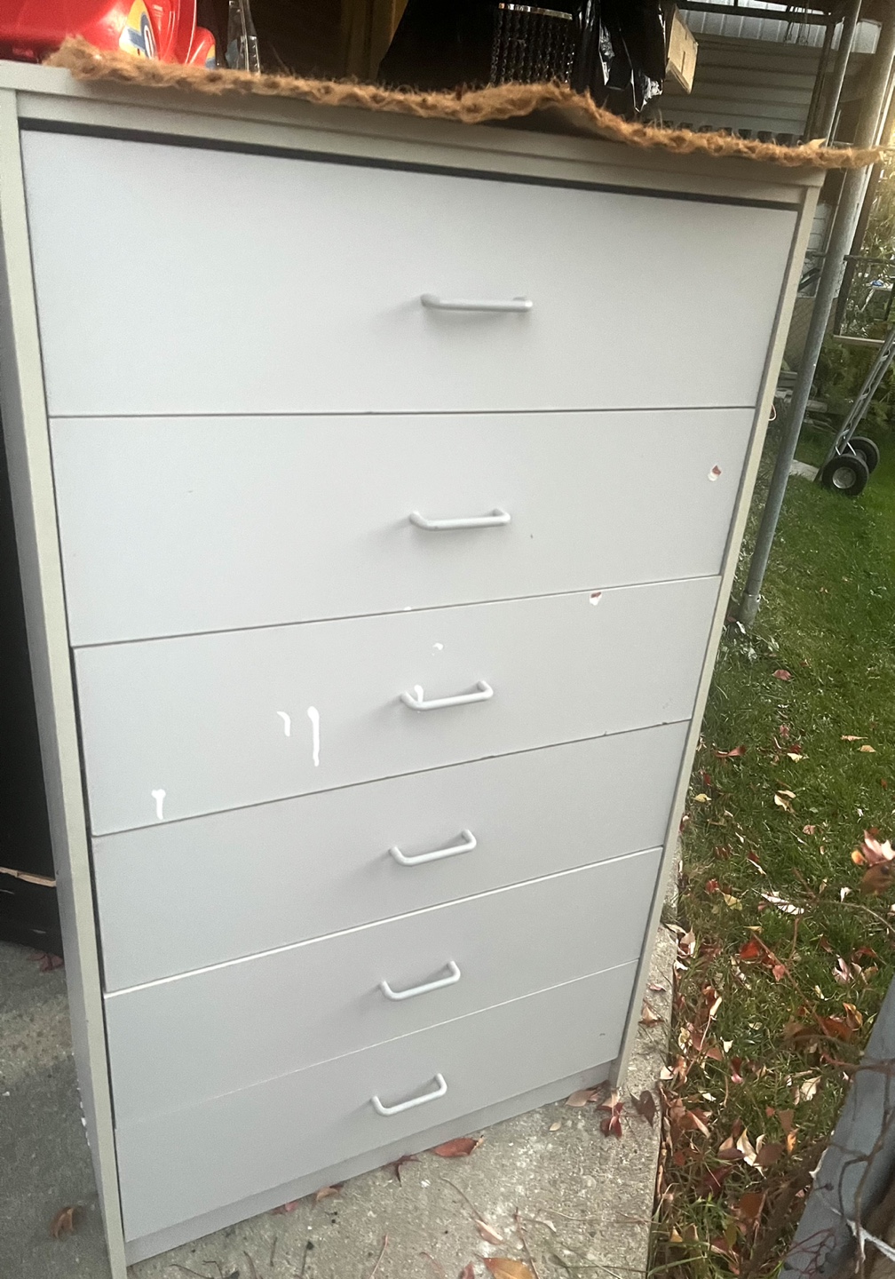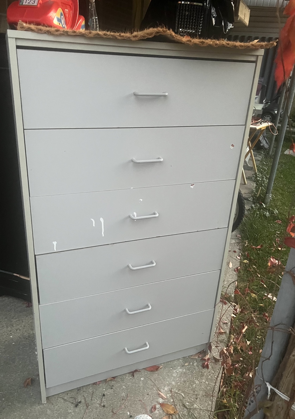 Selling a white dresser with six drawers. It's perfect for extra storage in a bedroom or closet. There are some signs of wear, but overall it's in good condition and very functional