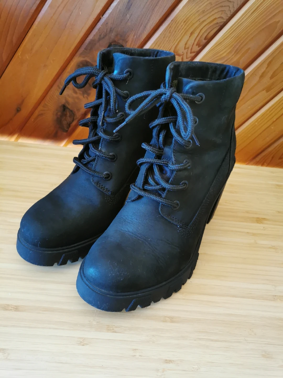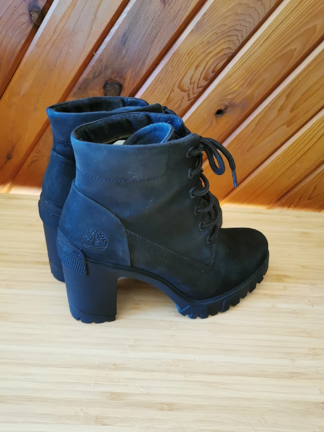 Black Nubuck Leather, block heel and water-repellant upper. Features smooth nubuck leather upper with Defender Repellent Systems treatment for water and stain repellency, lace-up style with a padded collar, block heel, cushioned EVA foam footbed, and durable rubber lug outsole for traction. The Lana combines the ruggedness of traditional boots with a more contemporary, heeled design making them perfect for both casual and more fashionable look. Warm and comfortable, size 8.5, heels about 3 inch, the boots themselves are about 7 inch tall. In great pre-owned condition